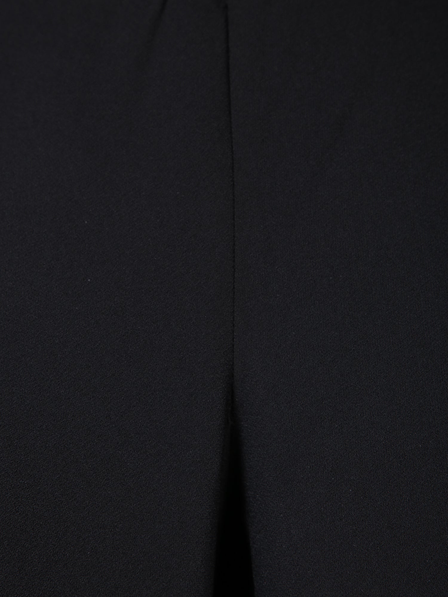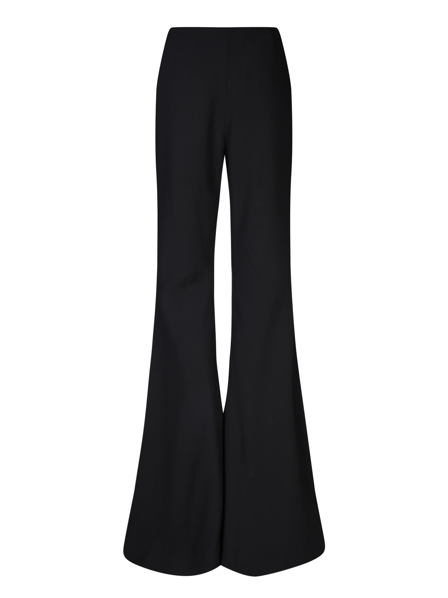 Black crepe flare trousers. No visible zipper design. High-waisted fit.