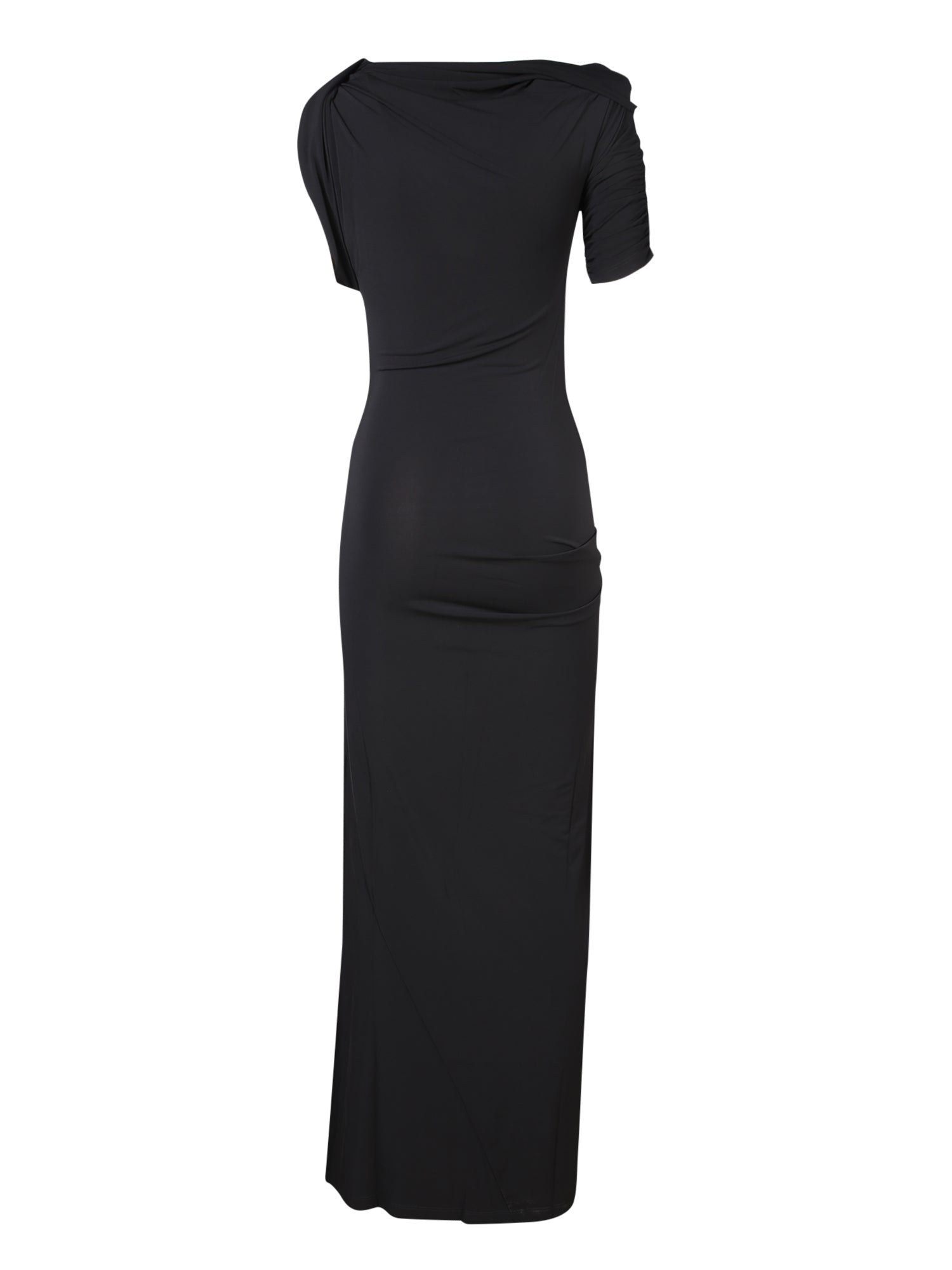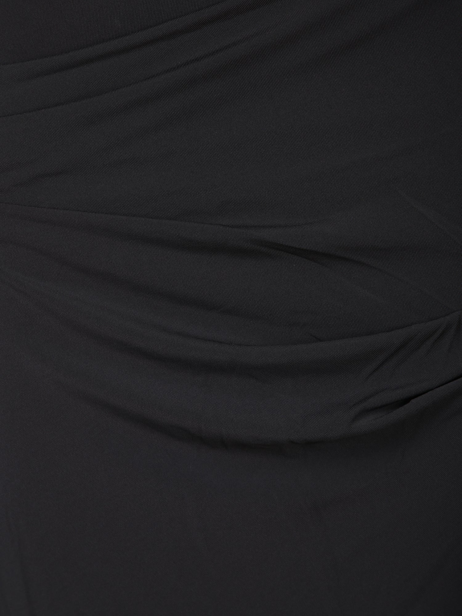Short-sleeved black viscose midi dress. Draped design with asymmetrical neckline.
