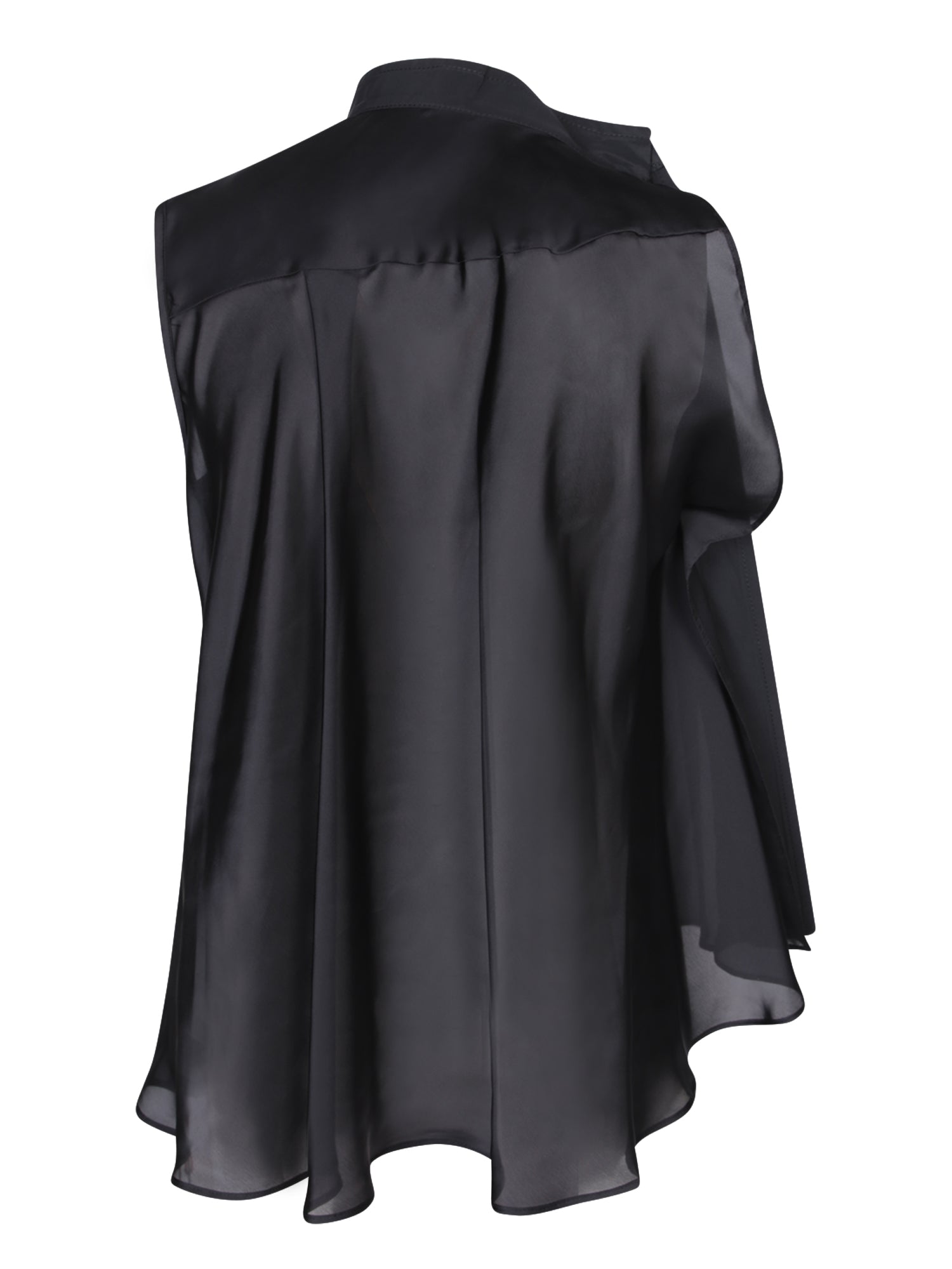 High neck. Multi-fabric panel structure. Sleeveless.