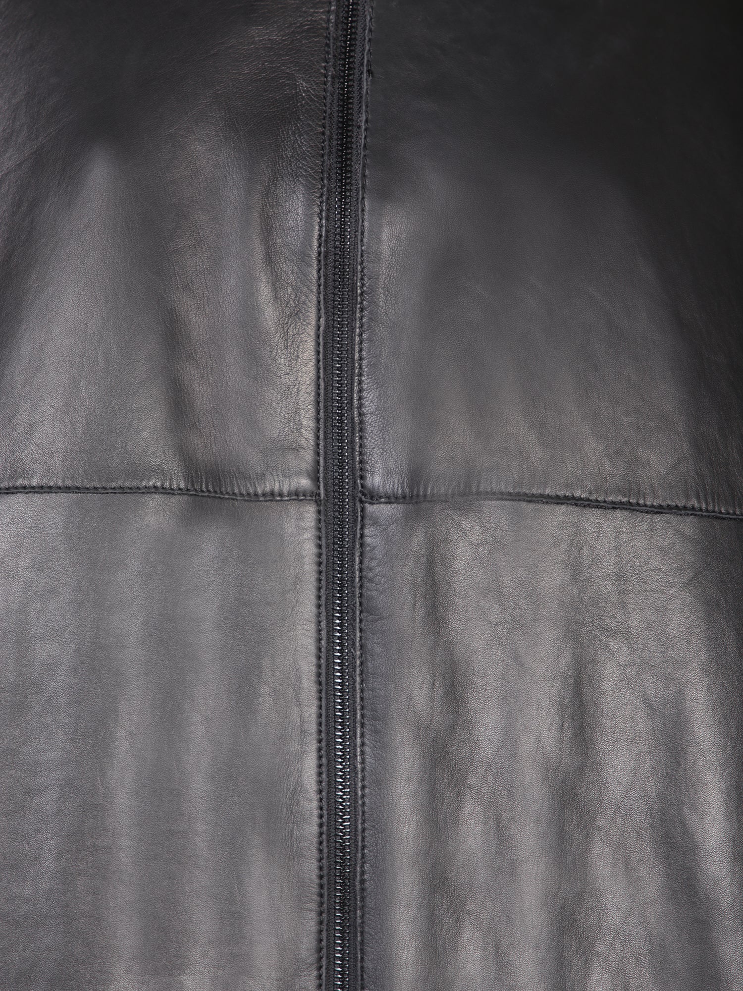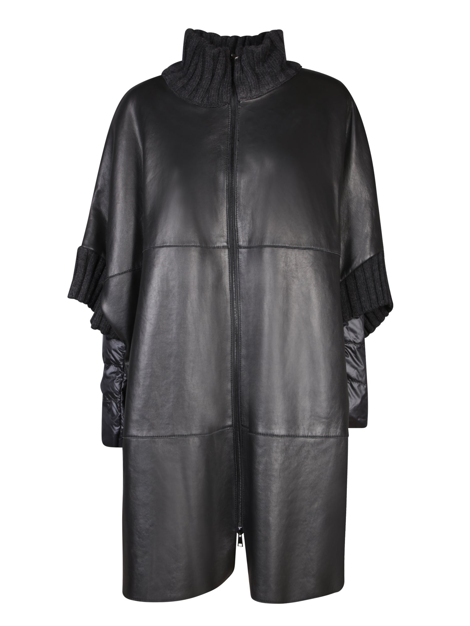 Leather coat with knitted collar, three-quarter sleeves, and a waist belt.