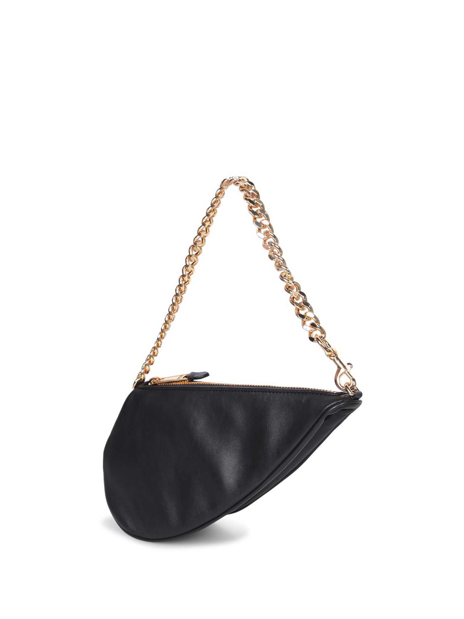Wide gold chain link strap. Top zip closure. Embossed Moschino Milano logo.