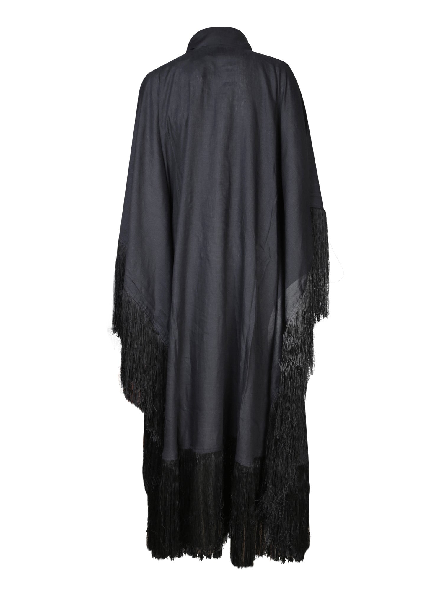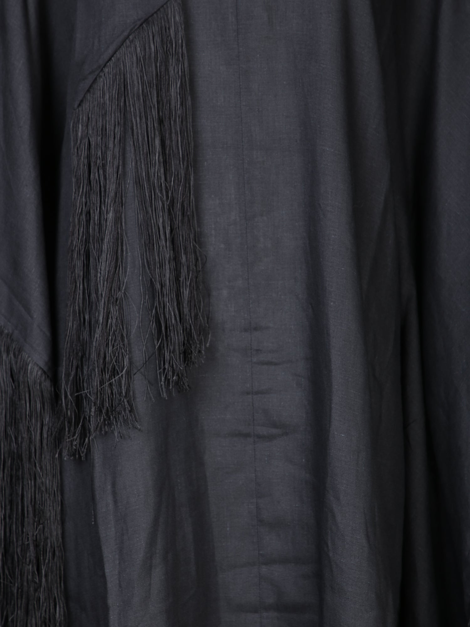 Light linen kaftan dress with decorative fringes, wide sleeves, and a raised collar.