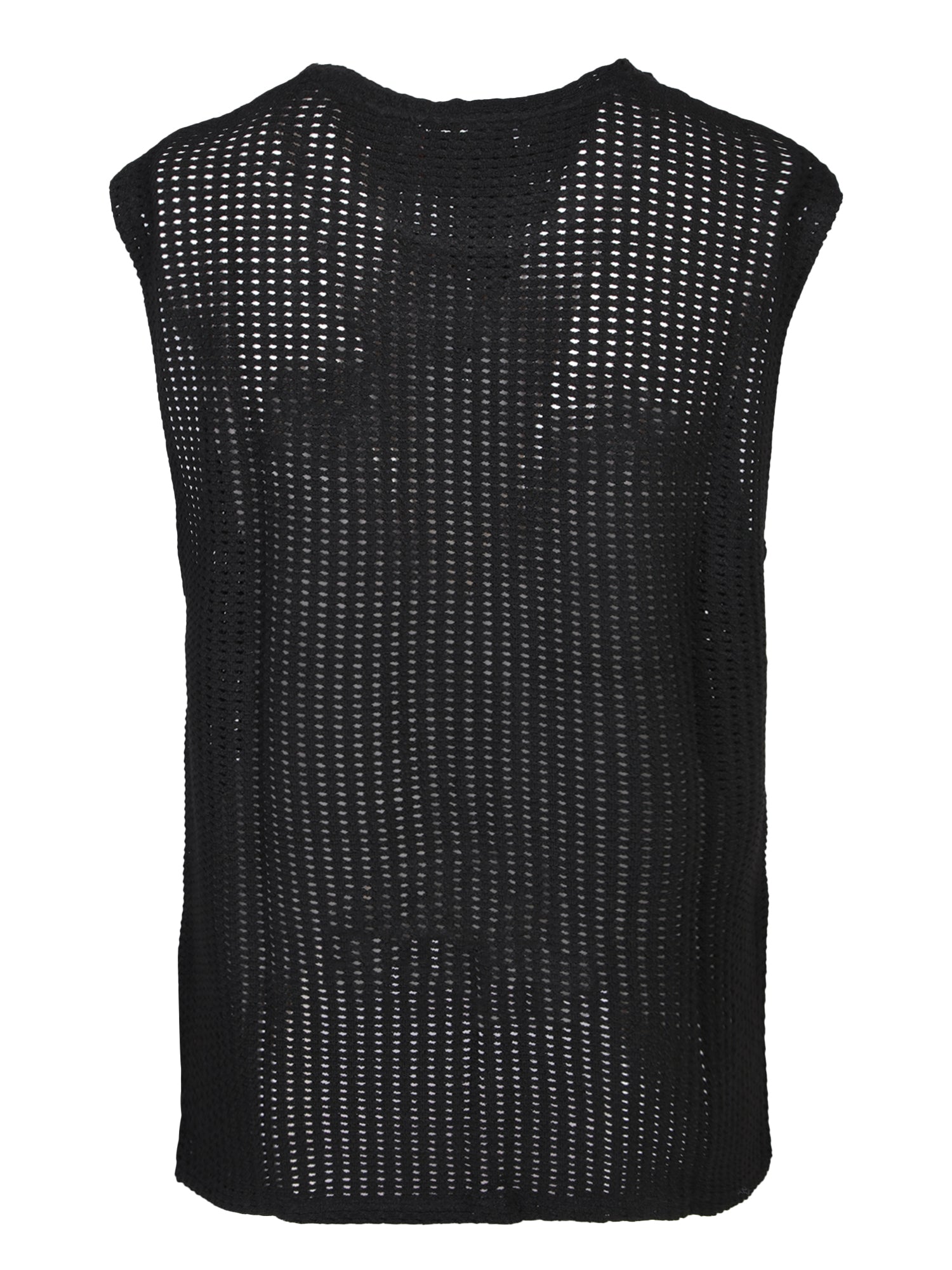 Sleeveless knit mesh top. Crew neckline. Straight hem.