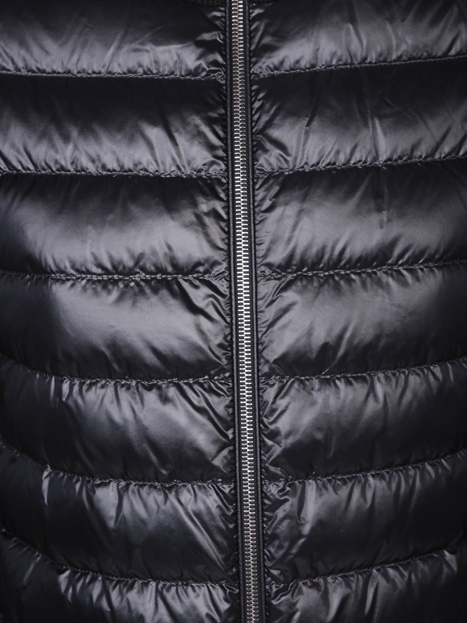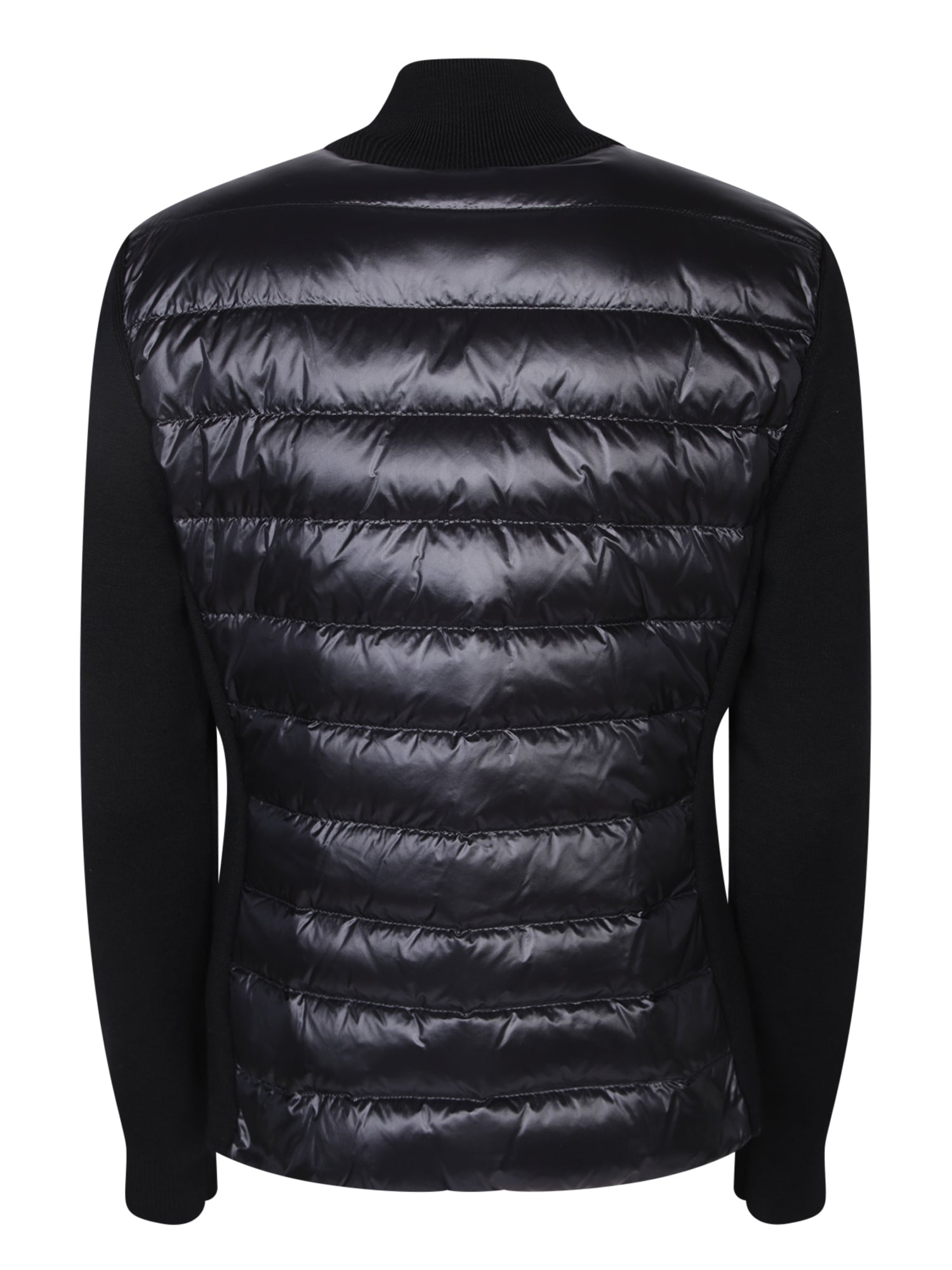Cardigan with padded panels. Long knit sleeves. High collar. Zip closure.