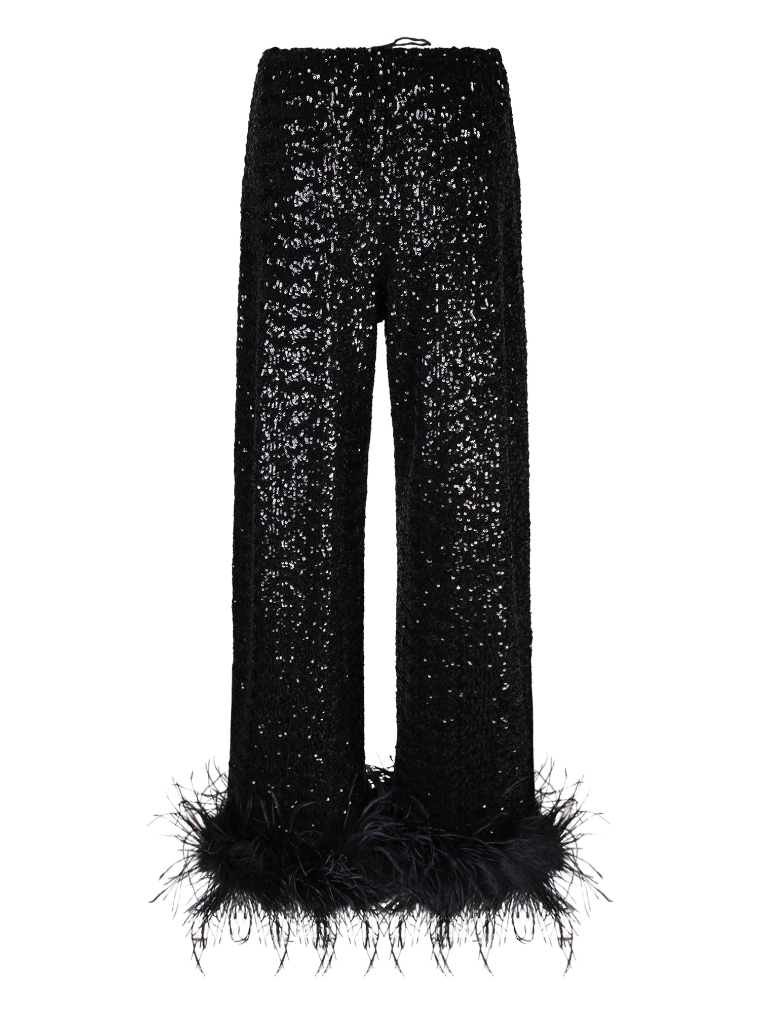 Glitter-knit trousers with elastic waistband. Feather trimmings at the ankles.