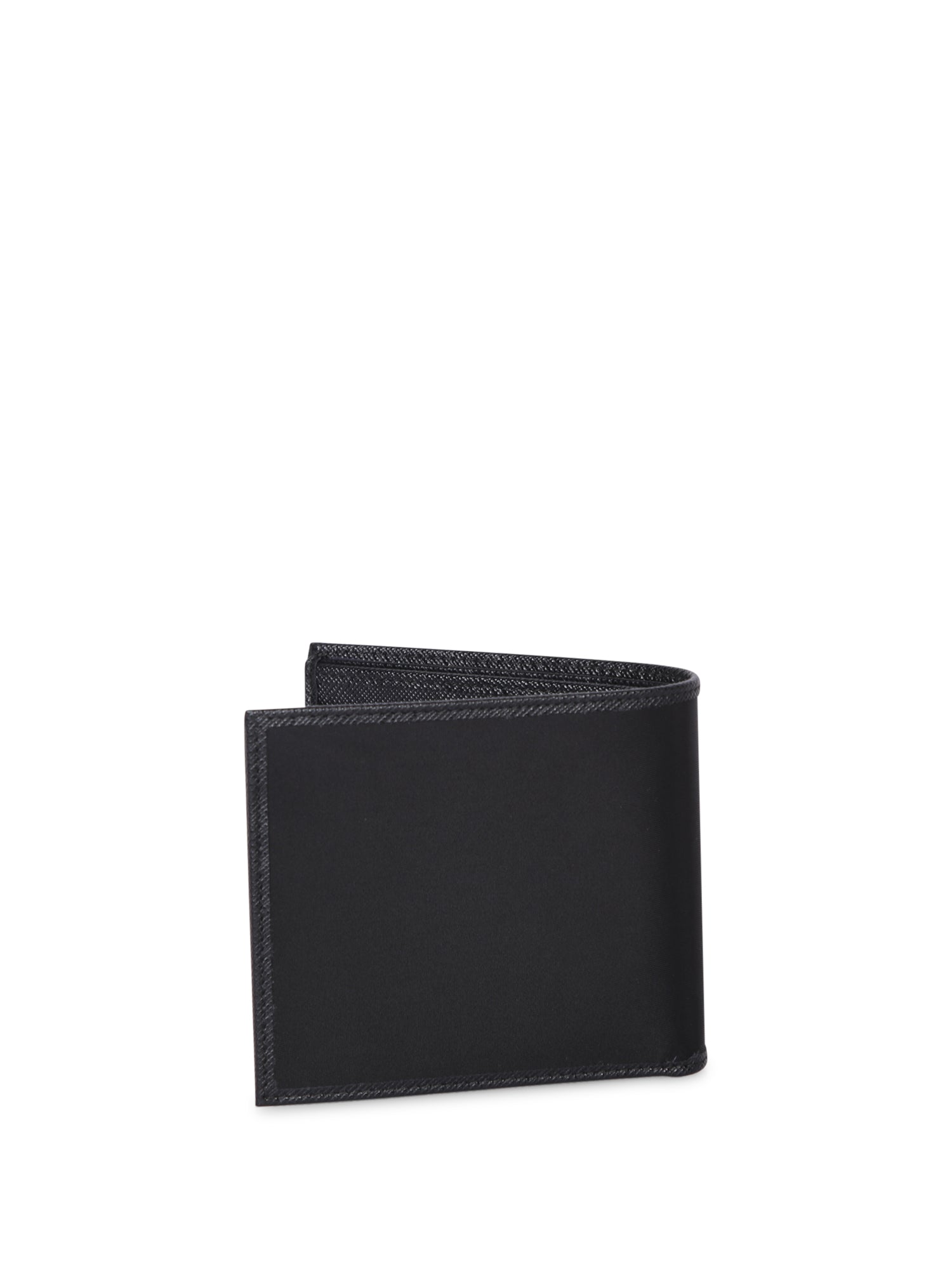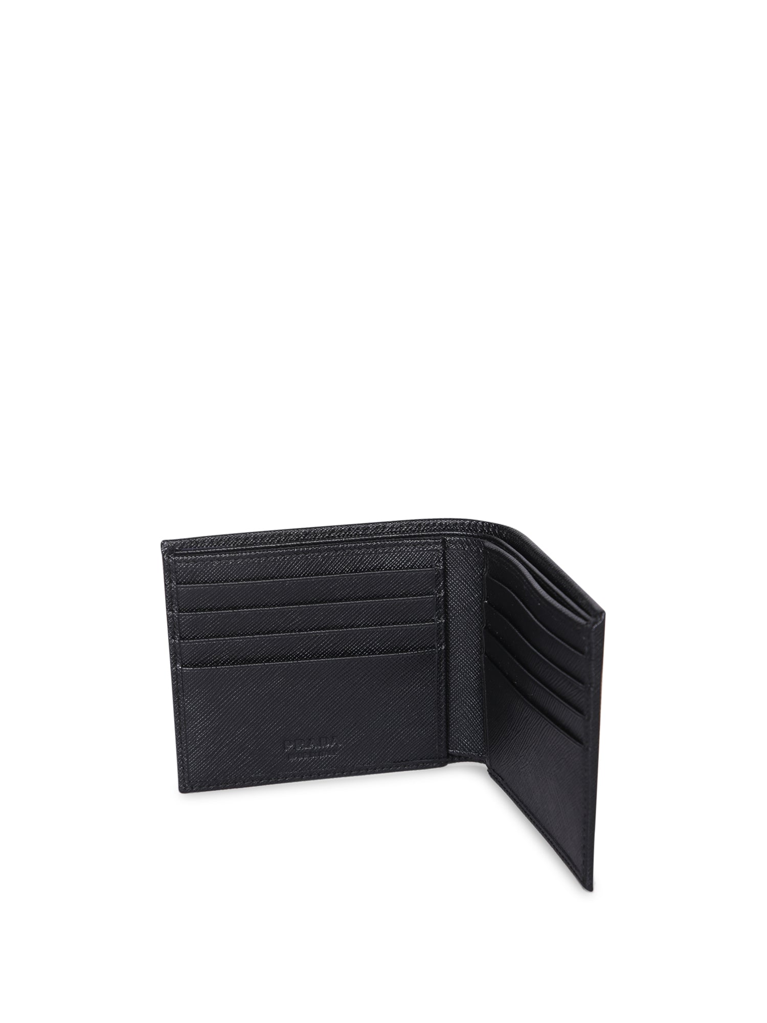 Saffiano leather with triangular metal logo. Organized interior with compartments for cards, bills, and a coin pocket.