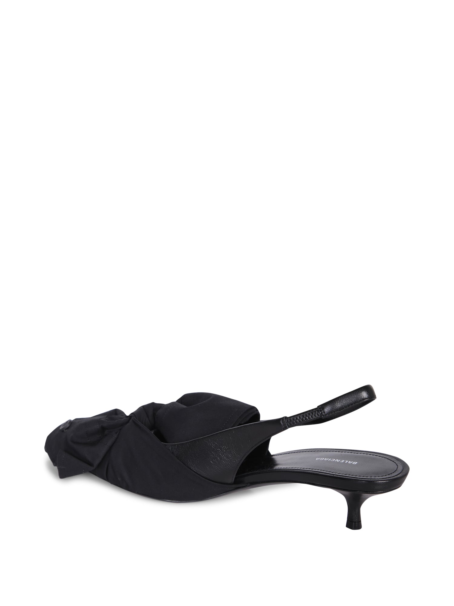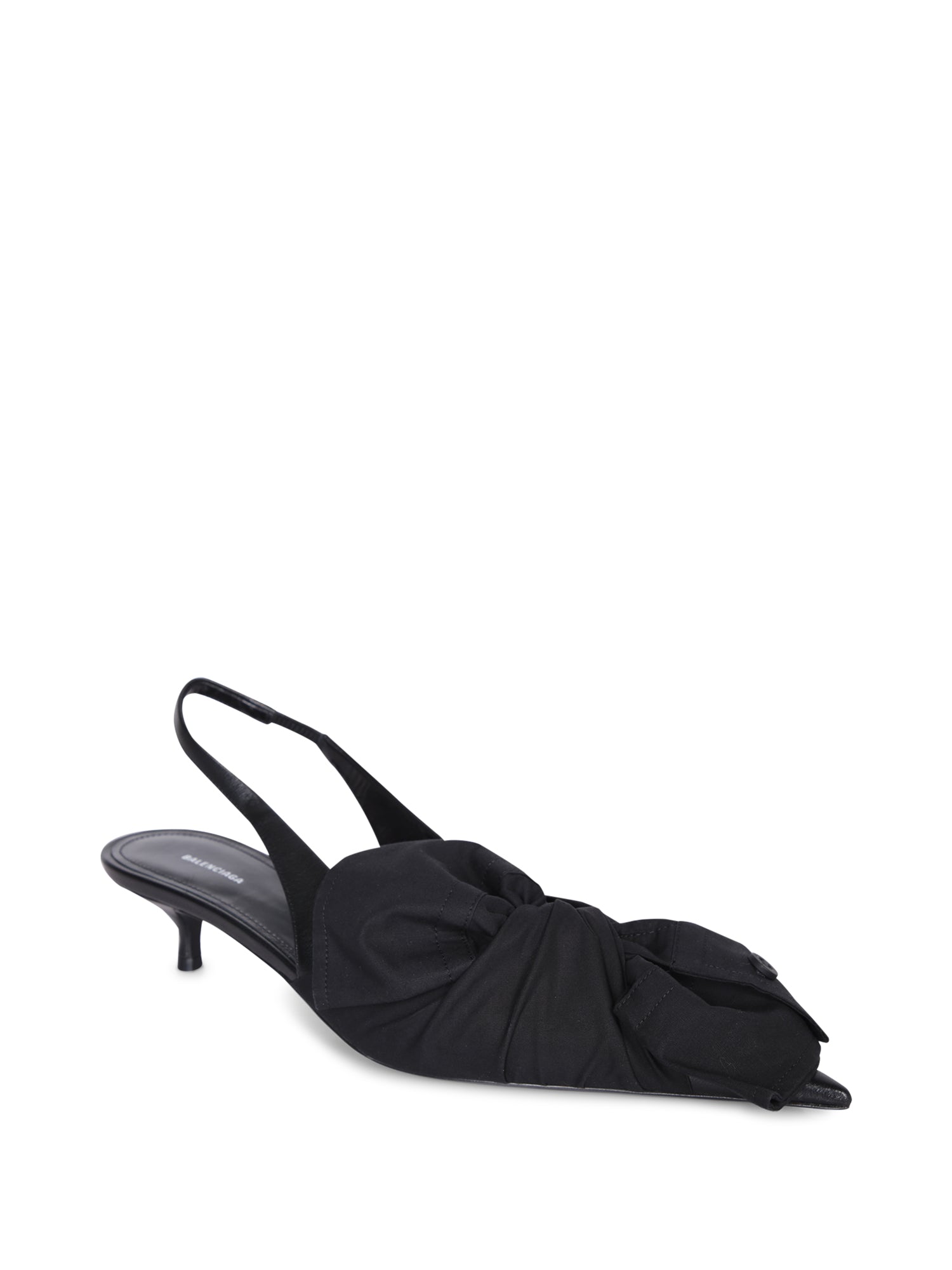 Black fabric slingback shoe. Pointed toe. Medium stiletto heel.