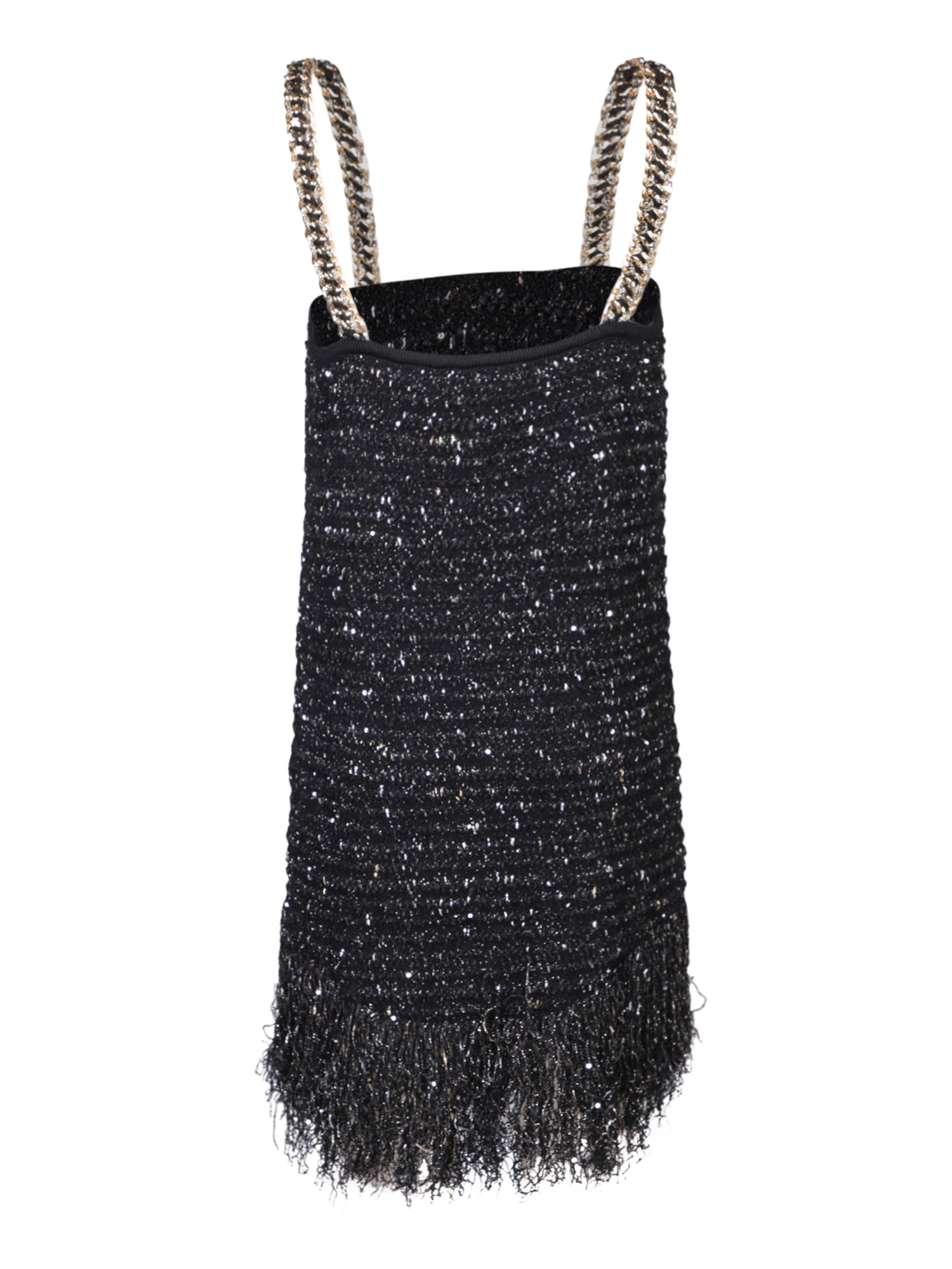Tweed mini dress with straps adorned with shiny details. Completed with long fringes at the hem.