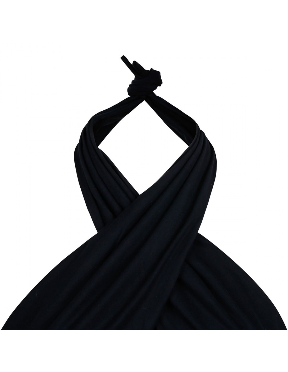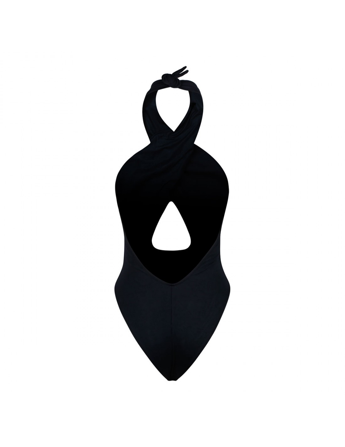 Black stretch technical fabric Italian Stallion swimsuit from Reina Olga featuring crossover halter top, cutout detail, high-waist bottom.