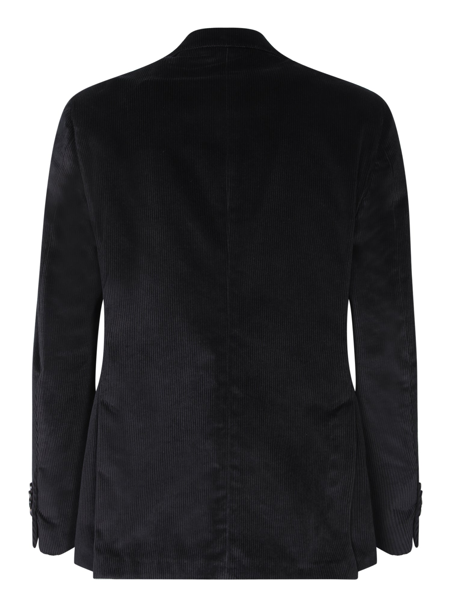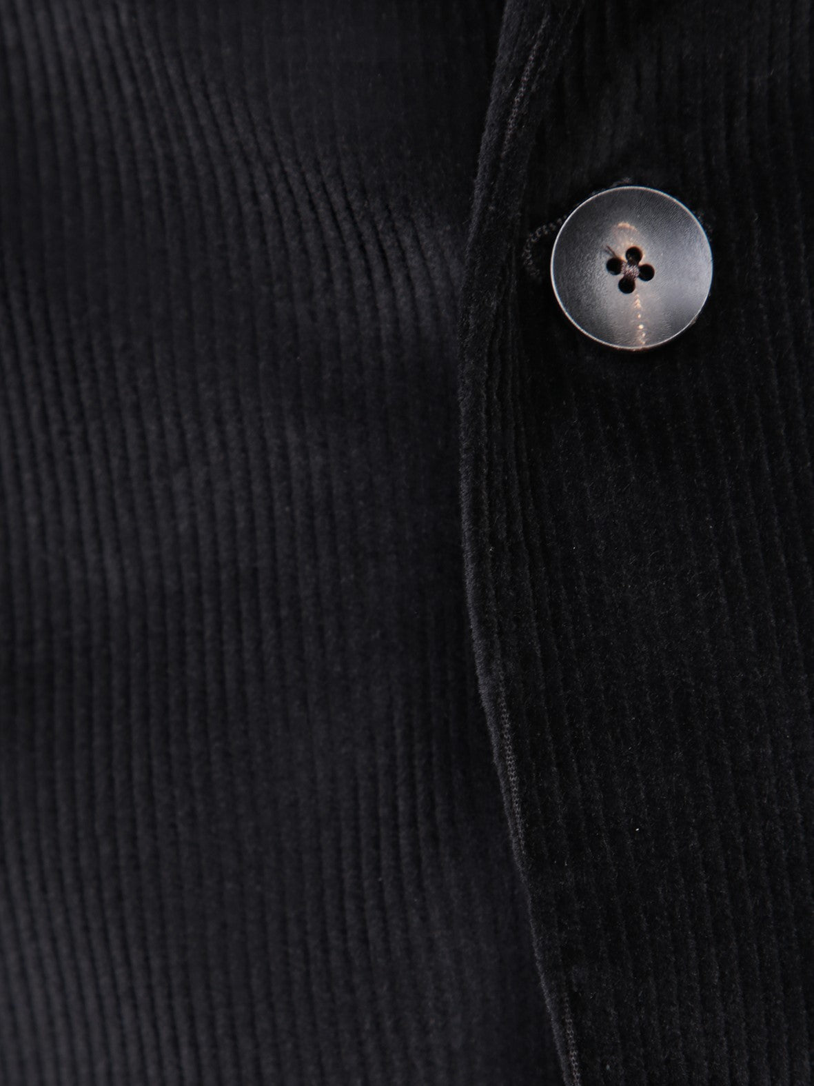 Single-breasted corduroy velvet jacket. Chest welt pocket, side flap pockets. Single button closure.