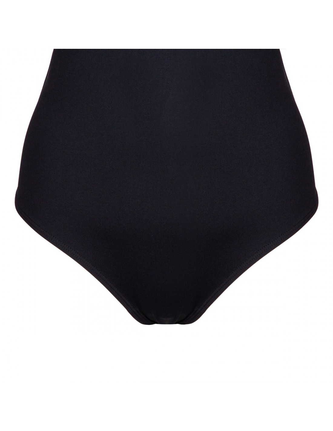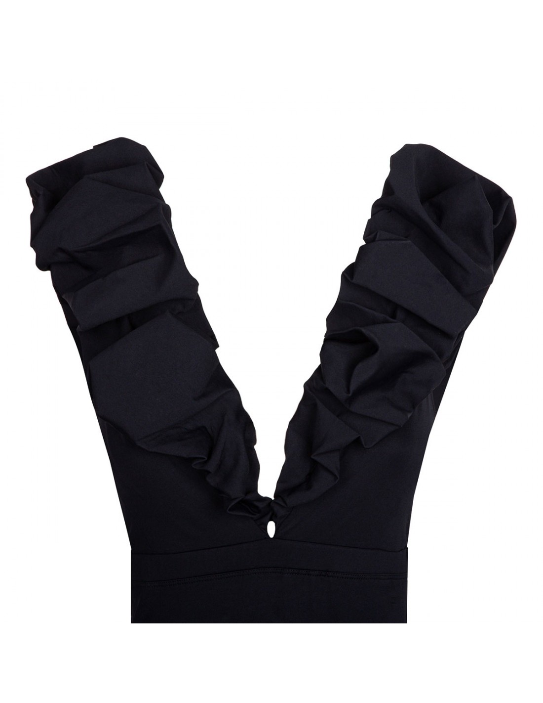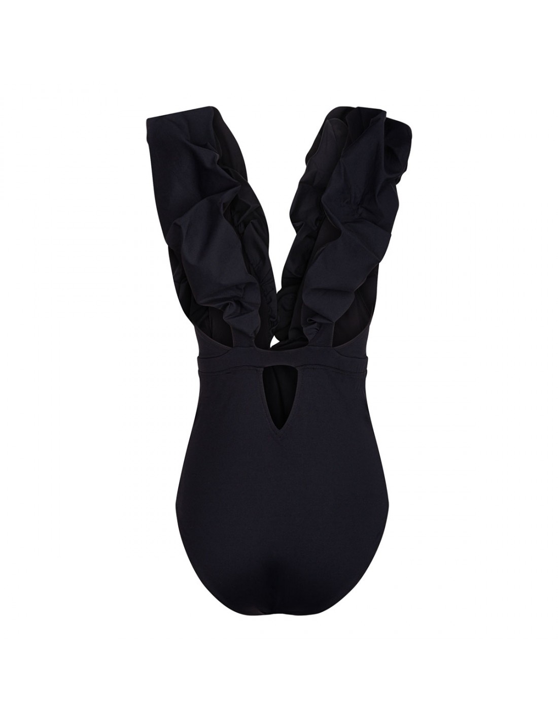 Black stretch tech fabric Palazzo swimsuit from Maio Paris featuring V-neck with elegant frills, deep V-neck at back.