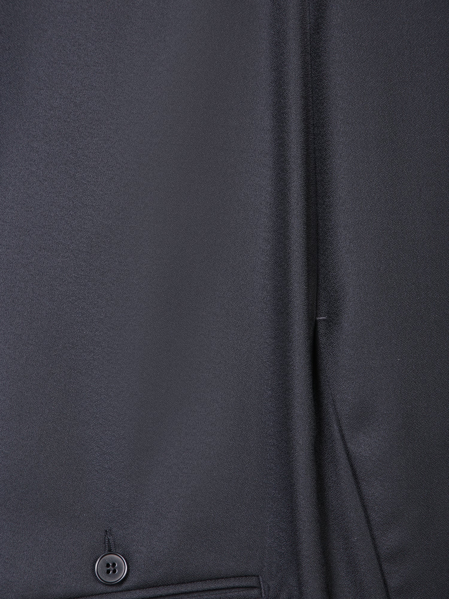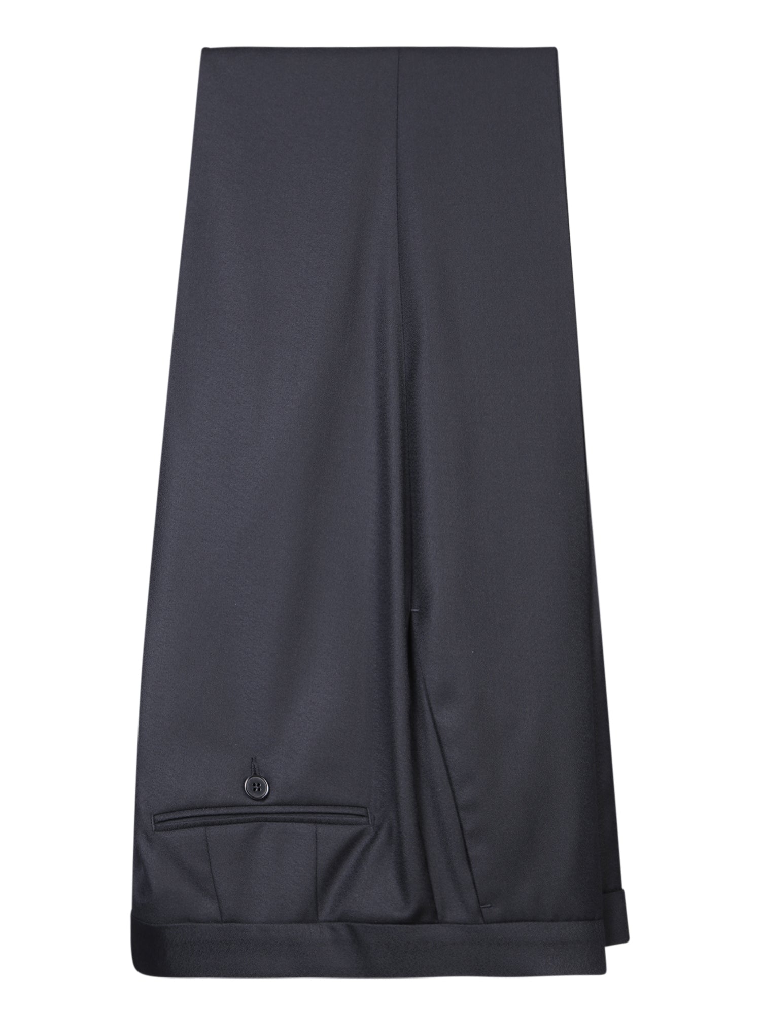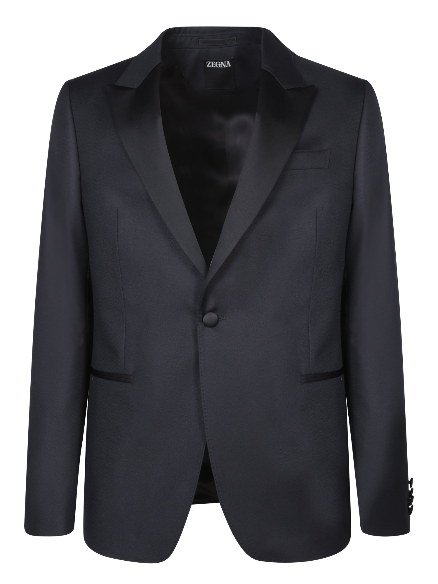 Jacket with peak lapels, single front button, welt pockets. Trousers with pleats, zip and button closure.