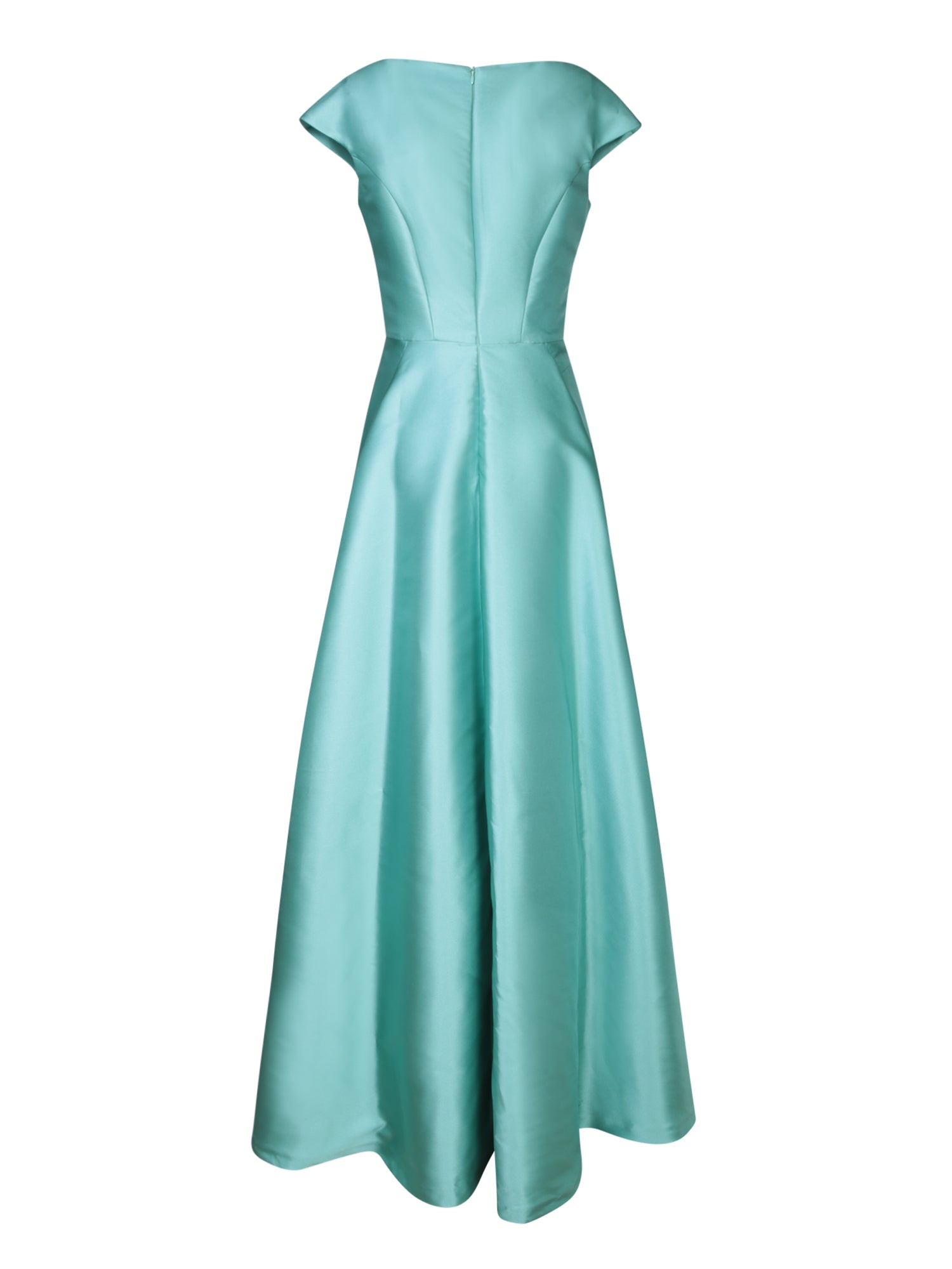 An exquisite aqua mikado long dress featuring a structured silhouette that flatters the figure, paired with tailored details for timeless elegance.
