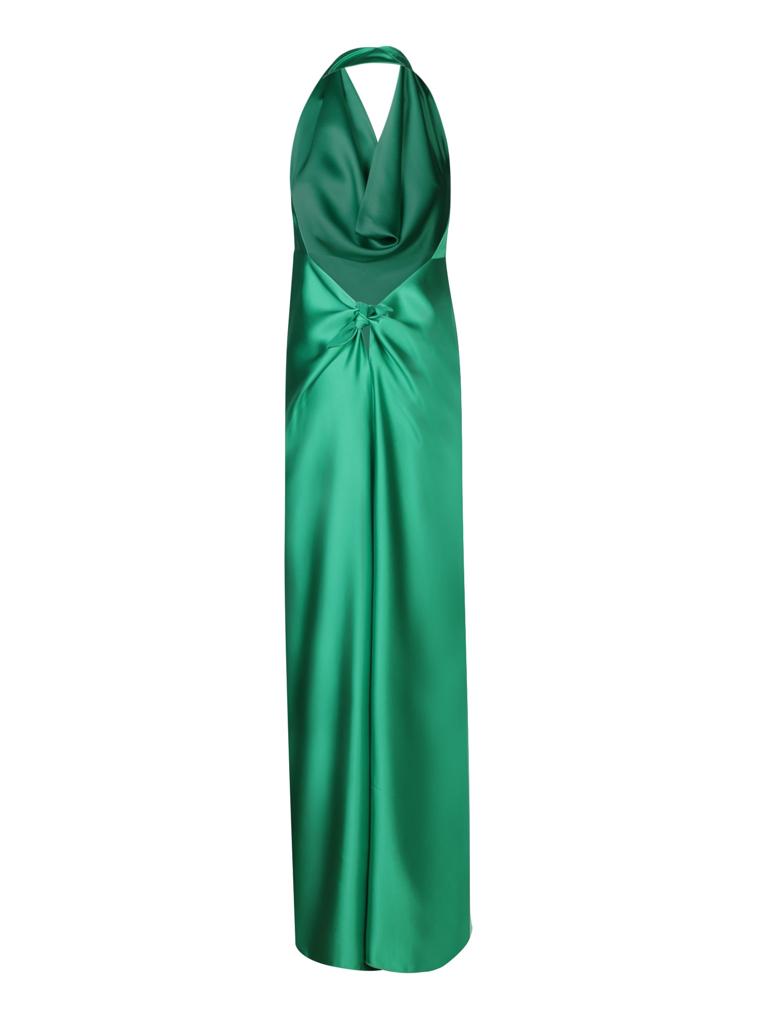 An exaltation of elegance, this green dress features a crossed halter neckline and a flowing column silhouette.