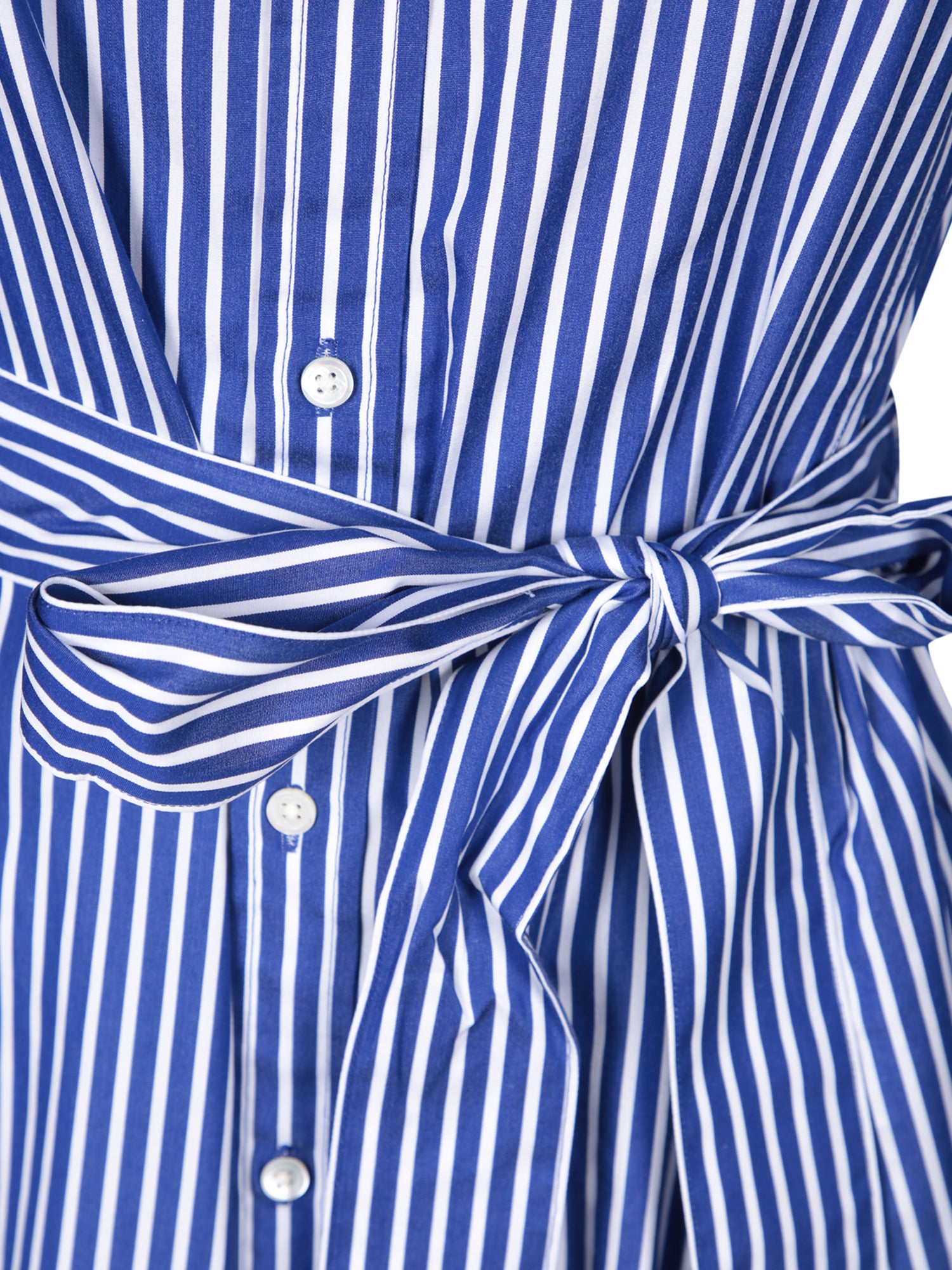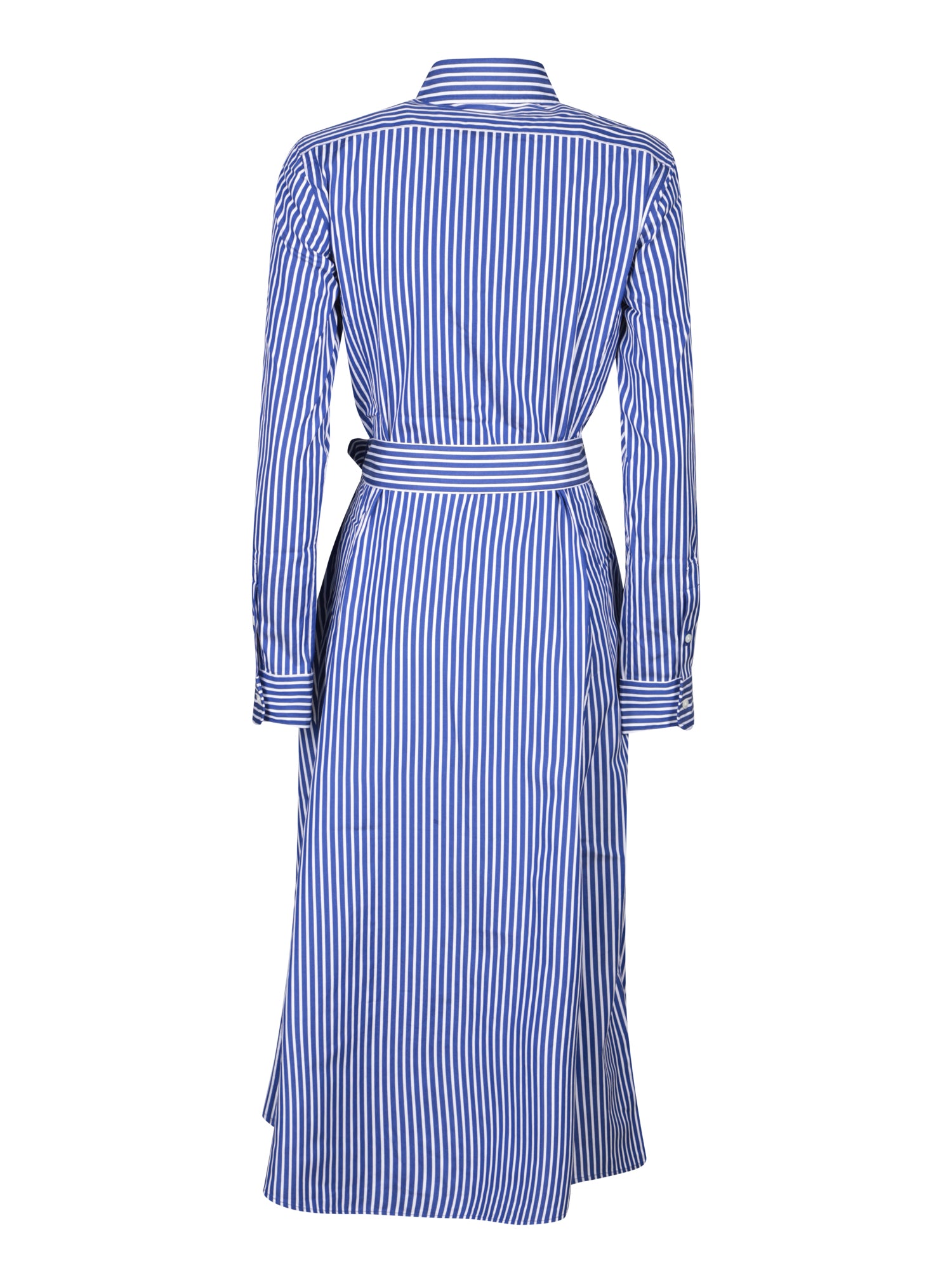 Vertical striped chemisier dress. Long sleeves with buttoned cuffs. Coordinated fabric belt.