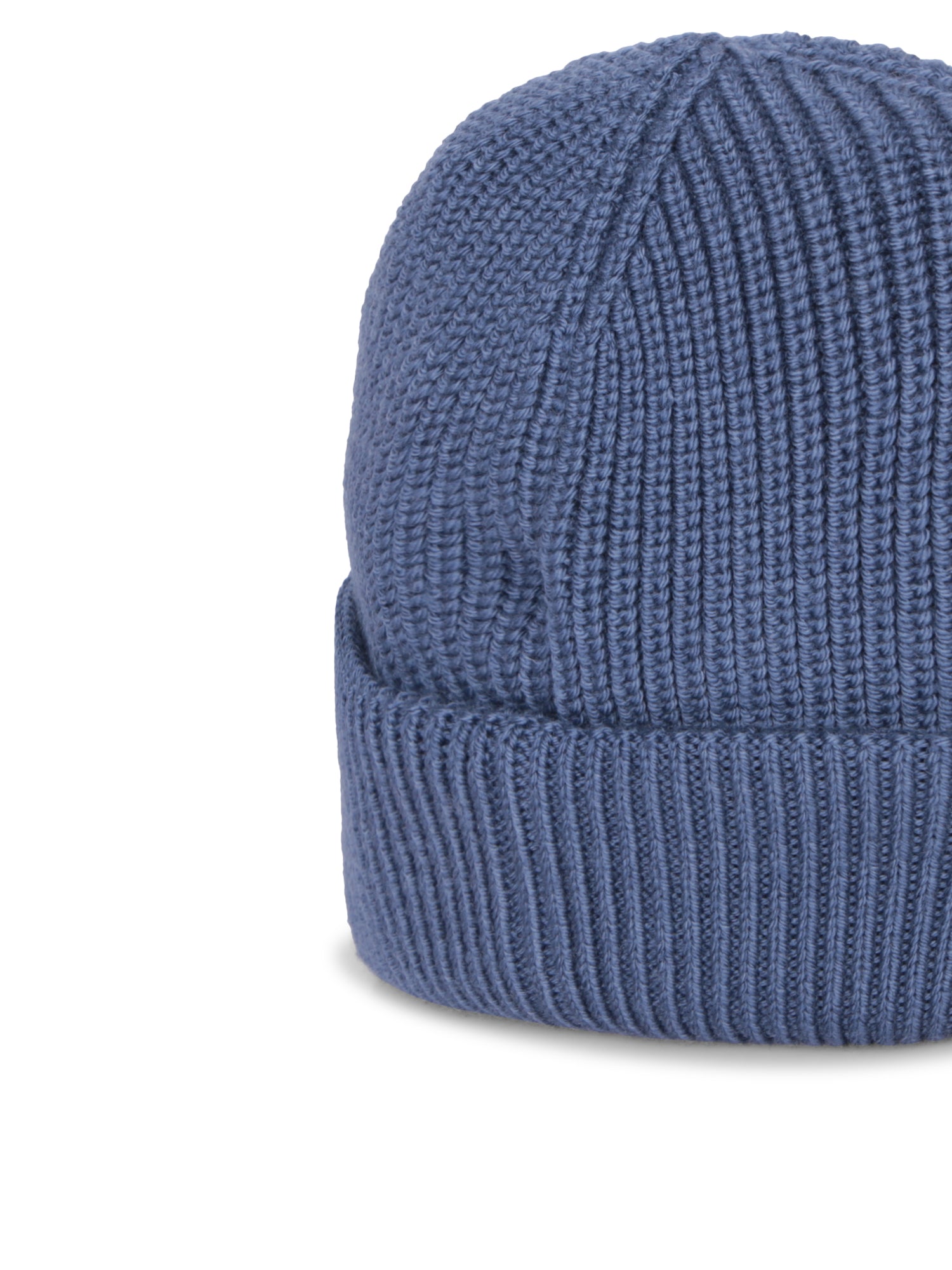 Knitted beanie hat. Front logo patch. Ribbed design.