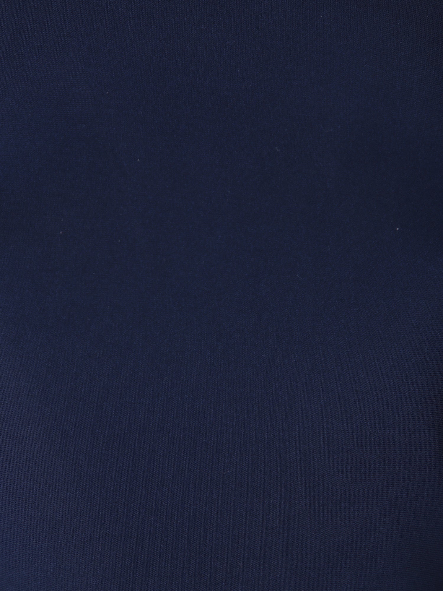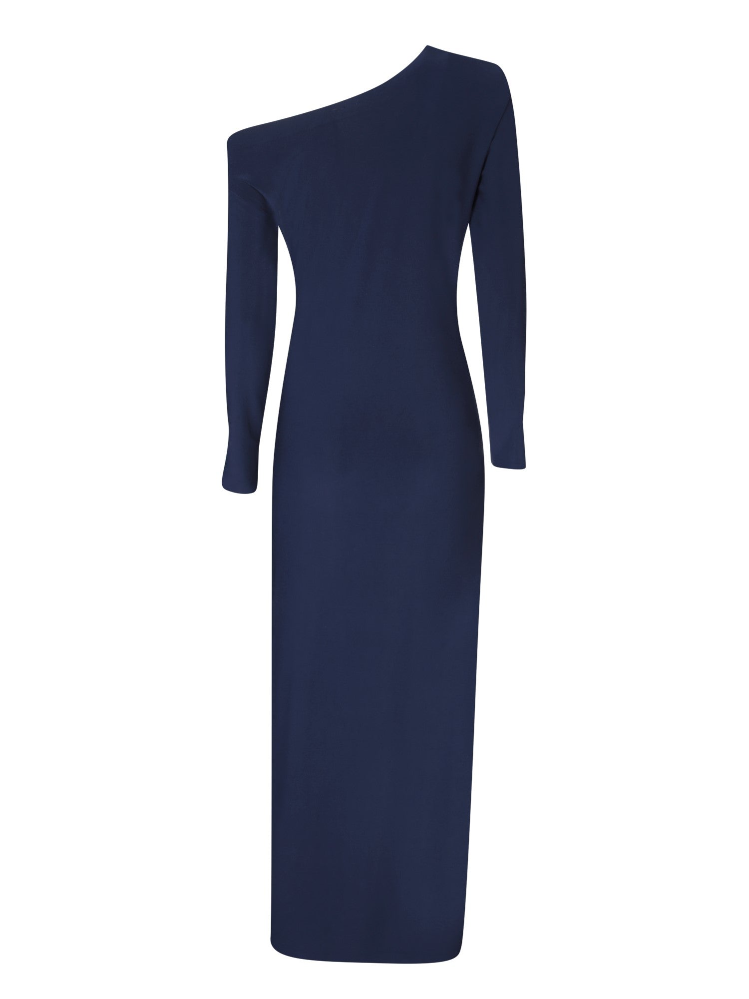 Long blue dress with one exposed shoulder, long sleeve, and a side slit.