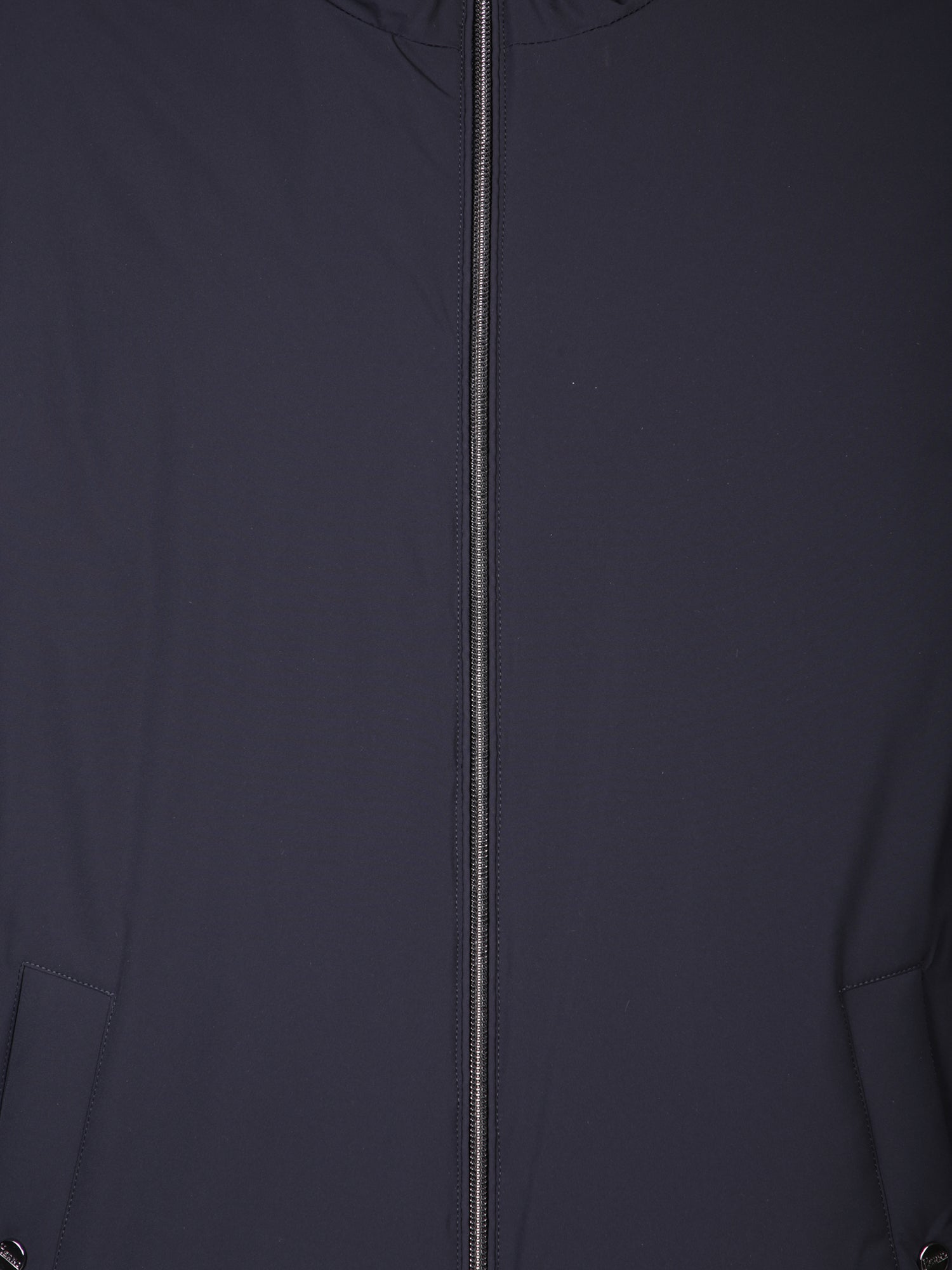 Blue three-quarter length coat featuring a hood, zipper closure, and side pockets.