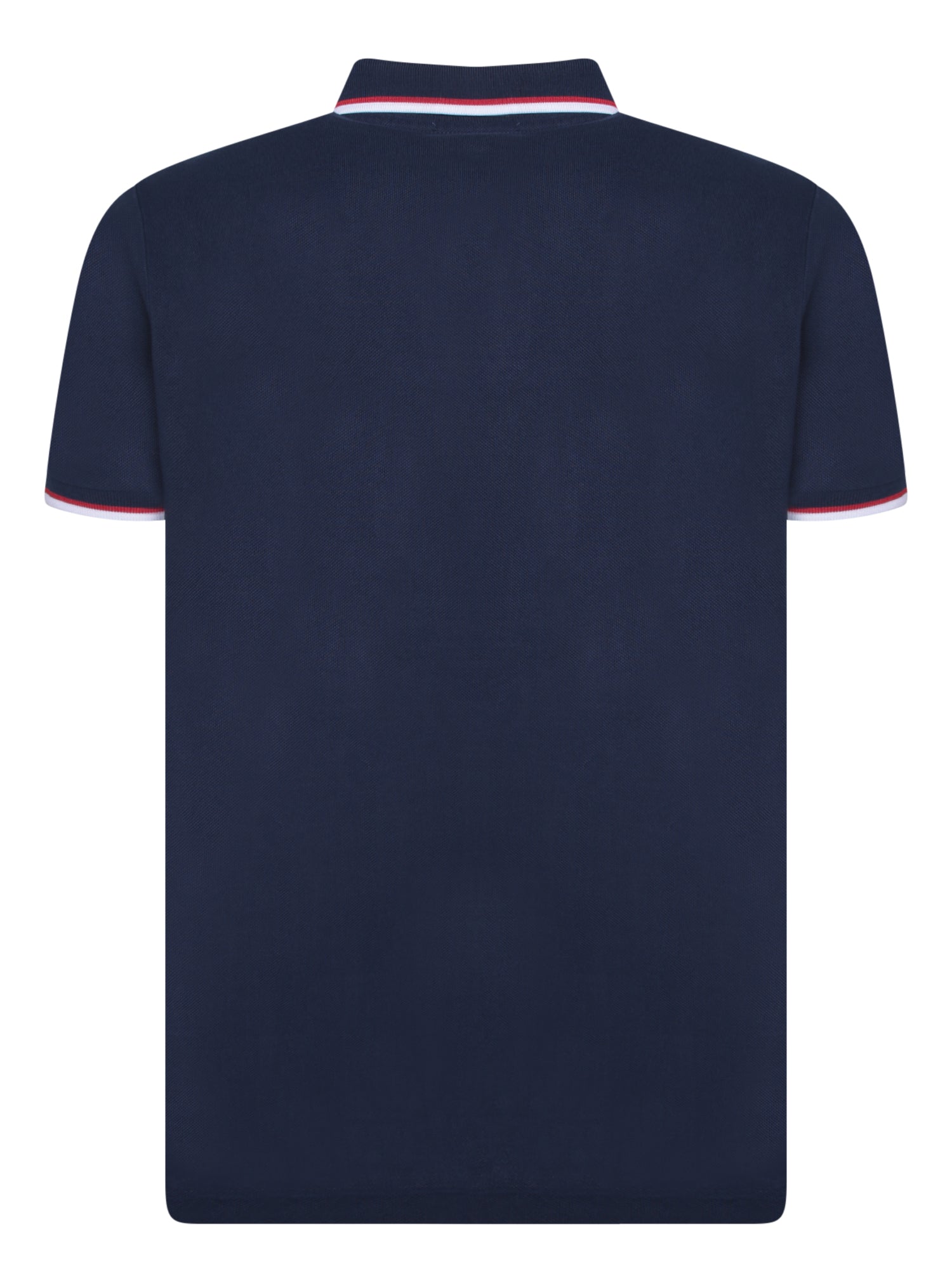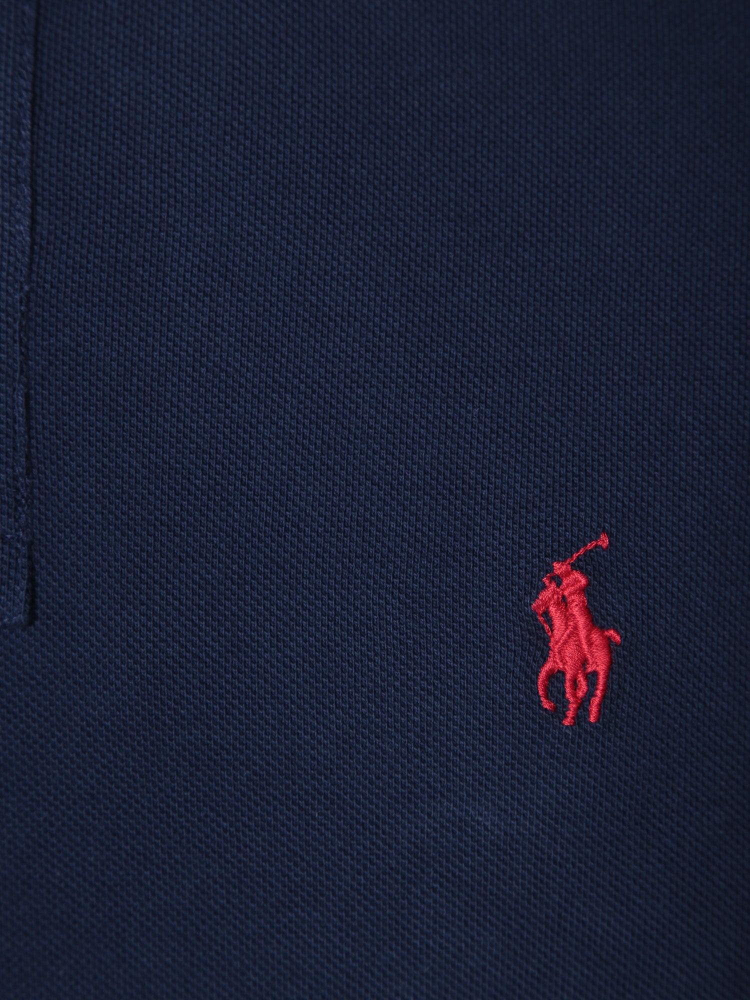 Short sleeves. Contrasting striped collar. Two-button placket.