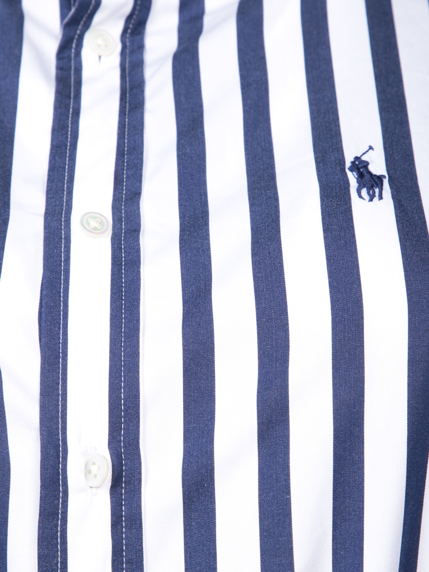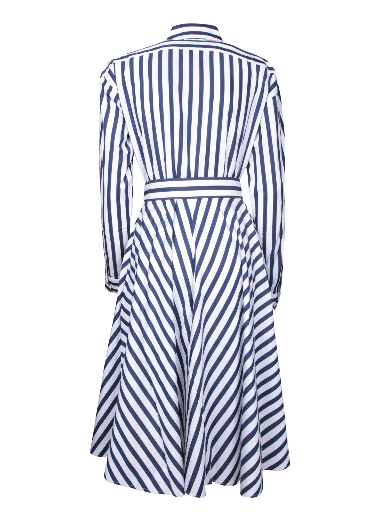 Long-sleeved dress, chemisier structure, blue and white vertical striped design, matching belt, front button closure.