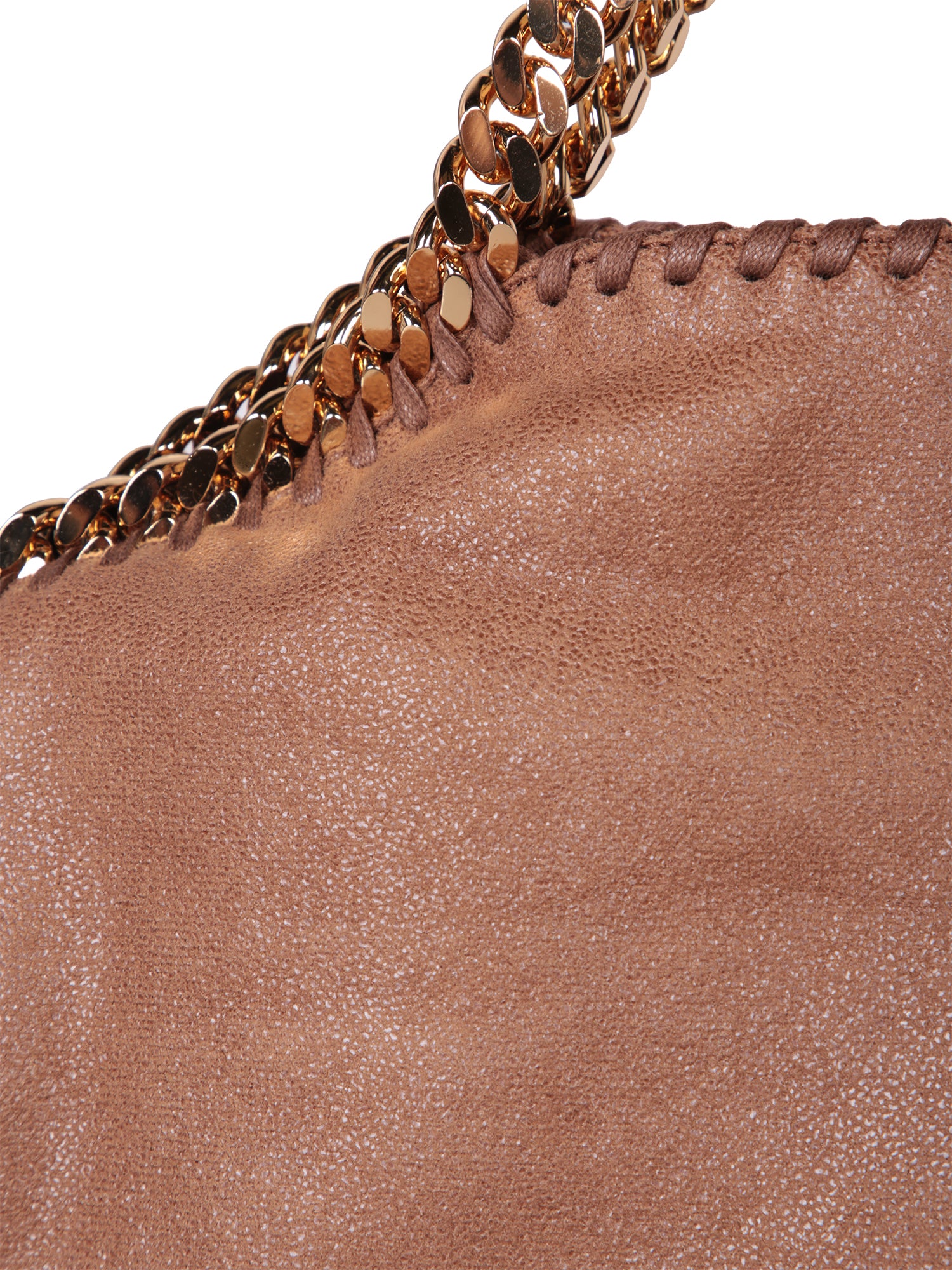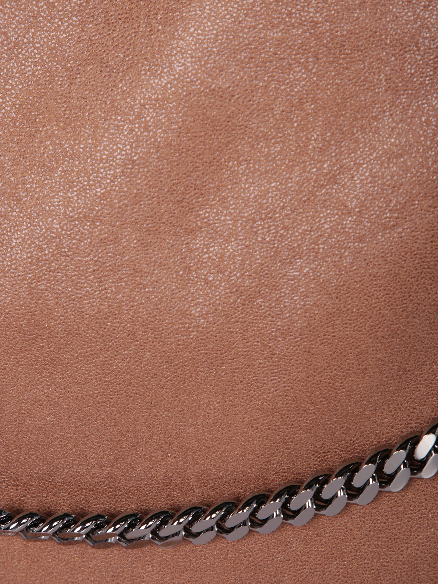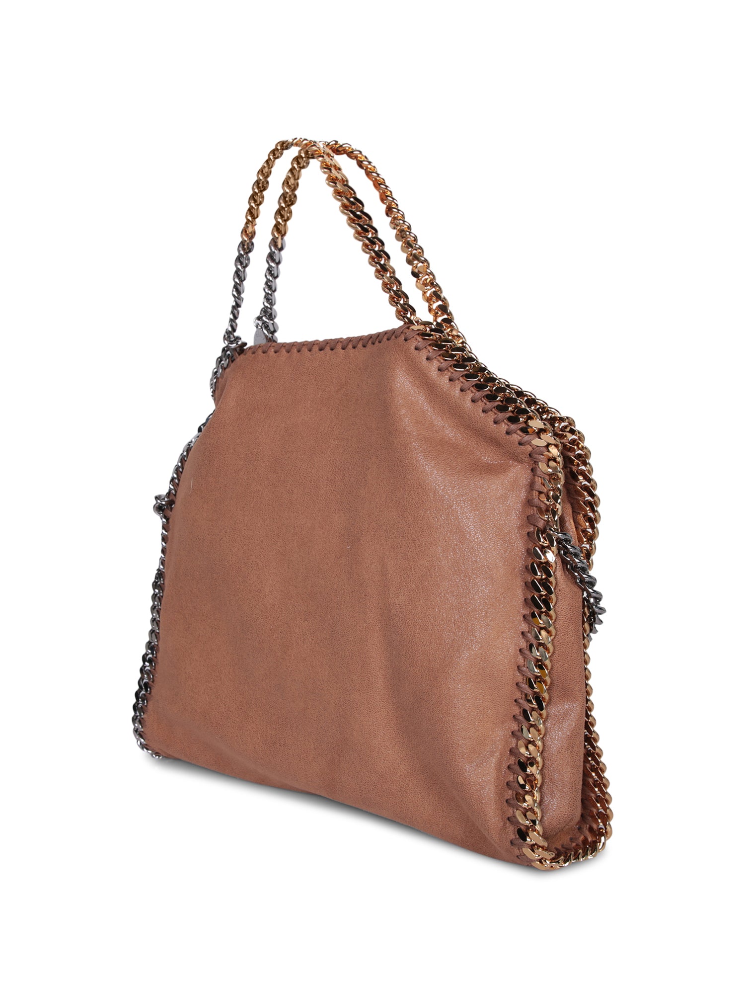 Brown faux leather bag. Tri-tone chain detailing along edges and as a shoulder strap. Magnetic closure.