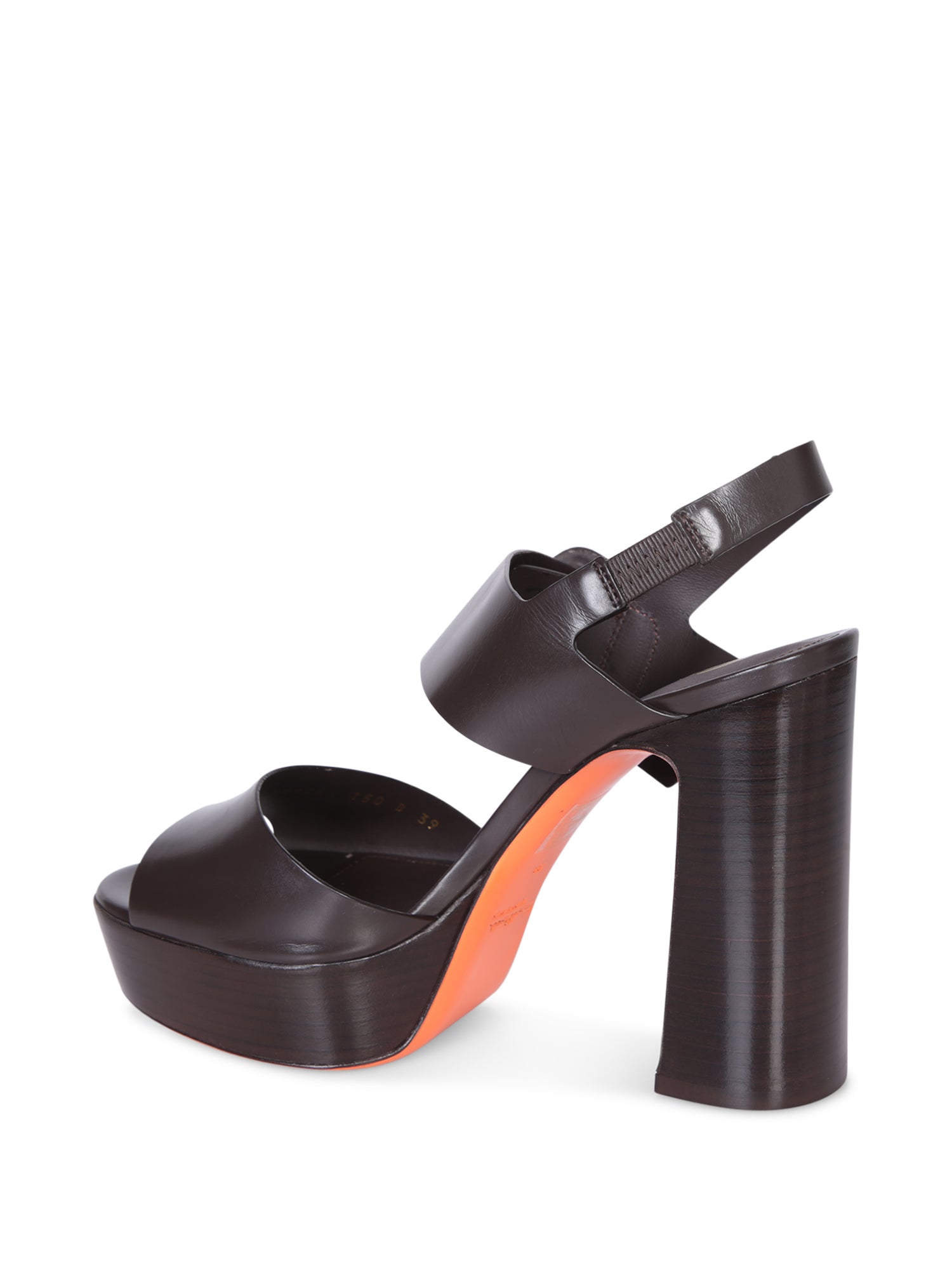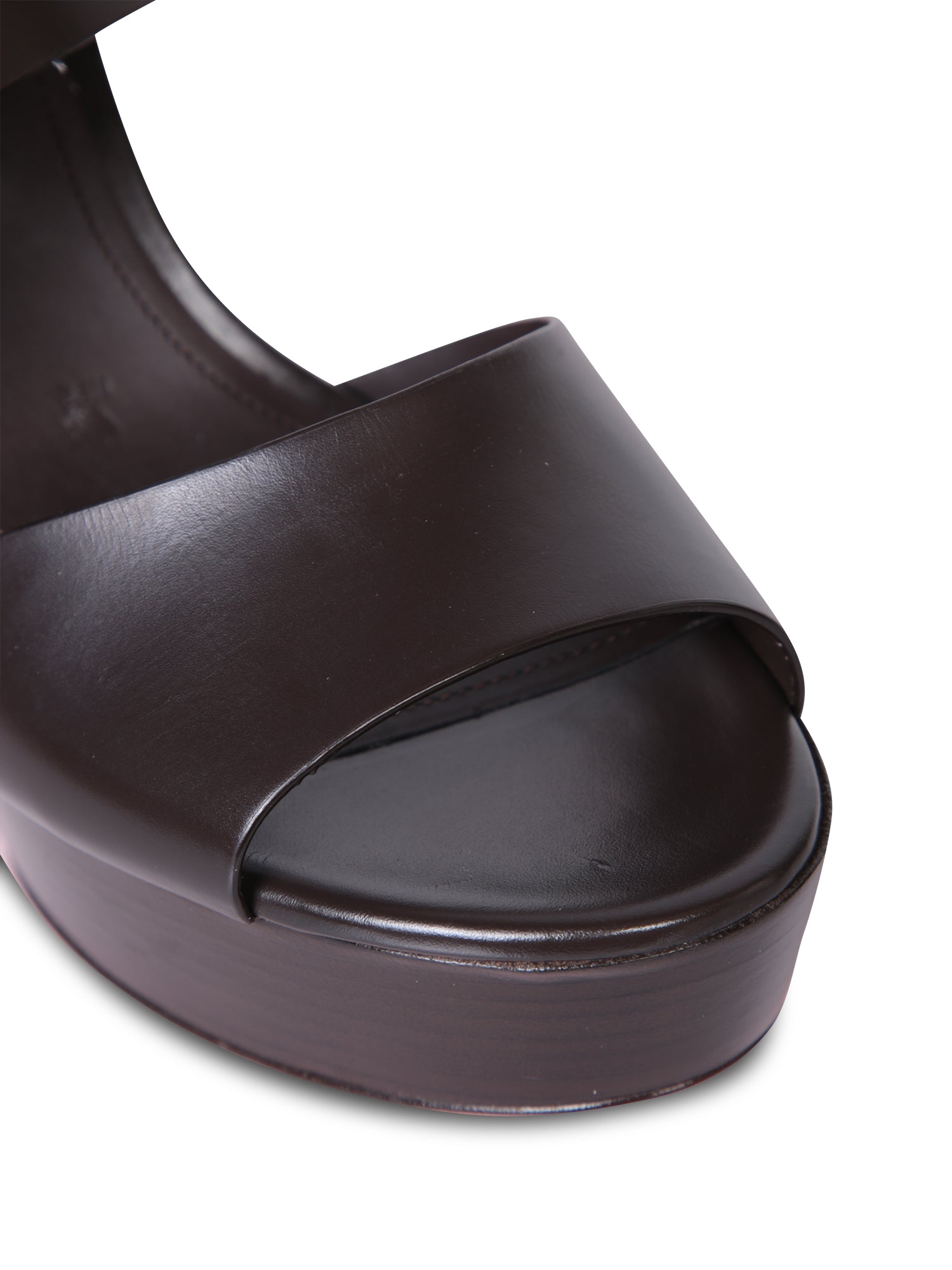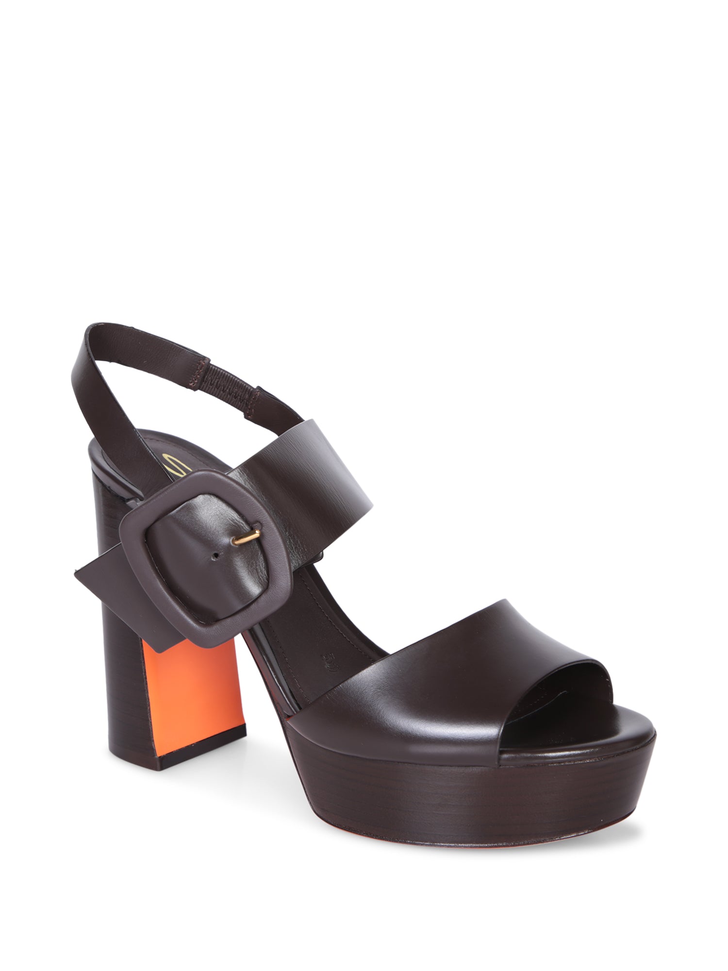 High platform sandals crafted from premium leather. Features an adjustable buckle and a distinctively colored heel.