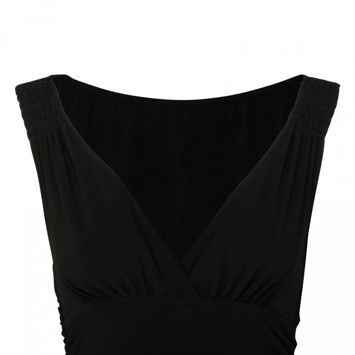 Black 4-way stretch Poly Lycra Tara gown from Norma Kamali featuring V-neckline, shirred sides, asymmetrical hem, fitted silhouette, sleeveless design.