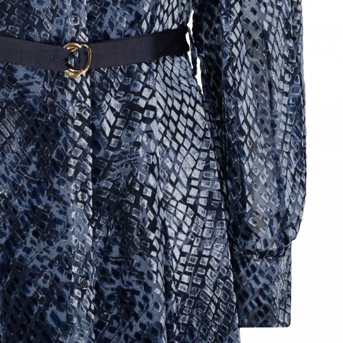 Marine blue velvet Thalia Dress from Ulla Johnson featuring moire motif, long-sleeves, body-skimming midi silhouette, detachable slip, grosgrain ribbon belt, button front closure and pointed collar.