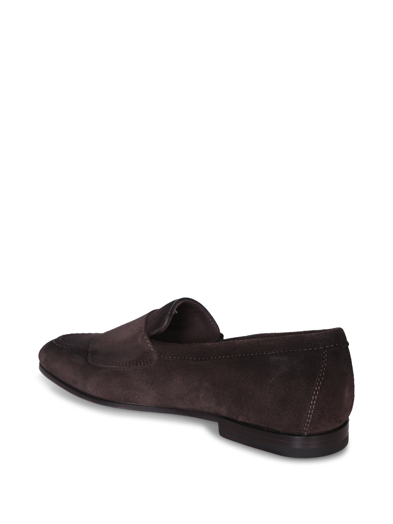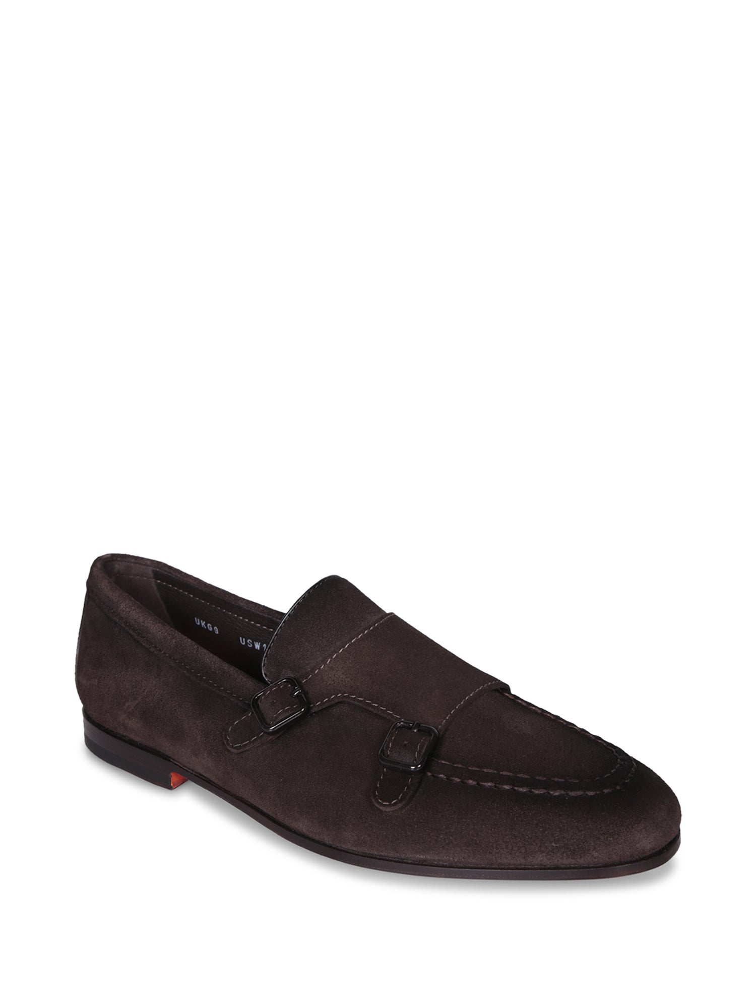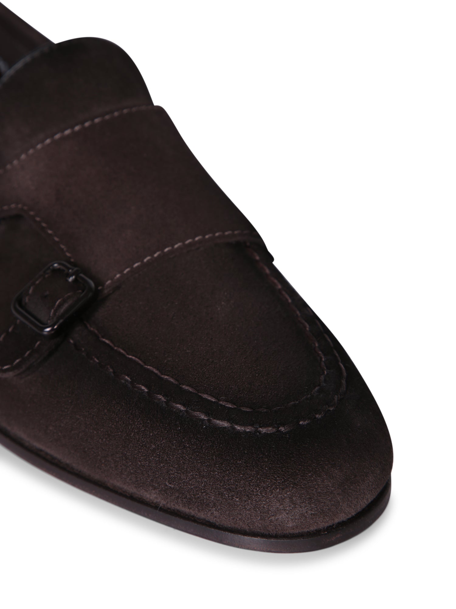 Suede leather Monkstrap shoes featuring a double buckle closure. Hand-stitched finishes.