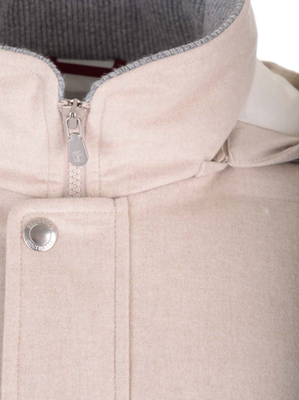Wool flannel down jacket by Brunello Cucinelli with double zip closure and snap buttons. Collar with ribbed knit insert and removable hood, lined and adjustable with drawstring. High zip pockets and low patch pockets with flap and button. Rib knit cuffs. Water-repellent nylon lining and high quality goose down padding.