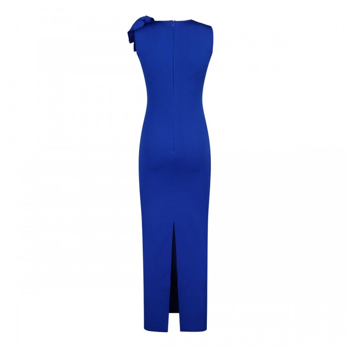 Blue flat knit maxi dress from Roland Mouret featuring ankle length, self fabric bow at left shoulder, fitted silhouette, concealed zip fastening along back.
