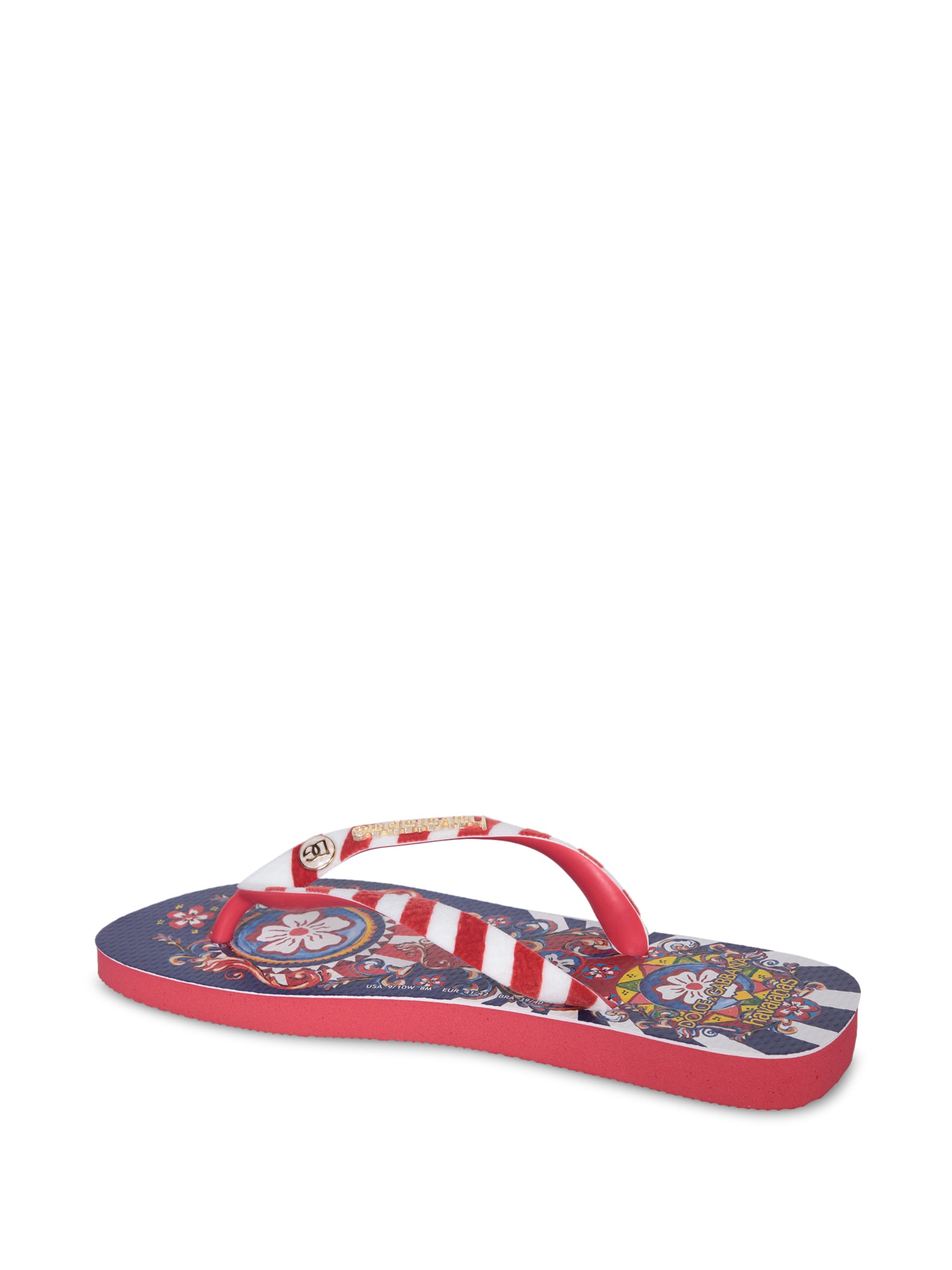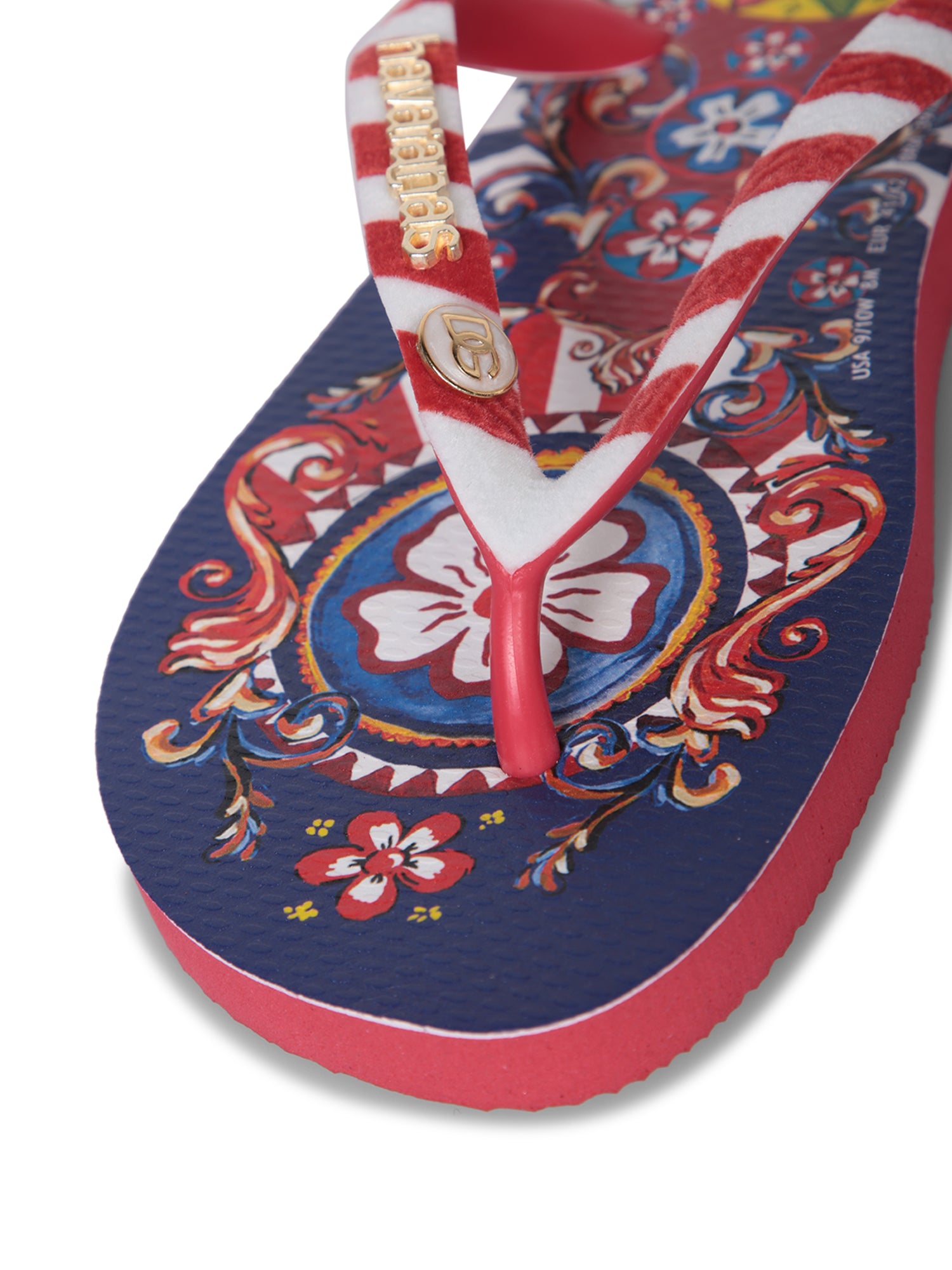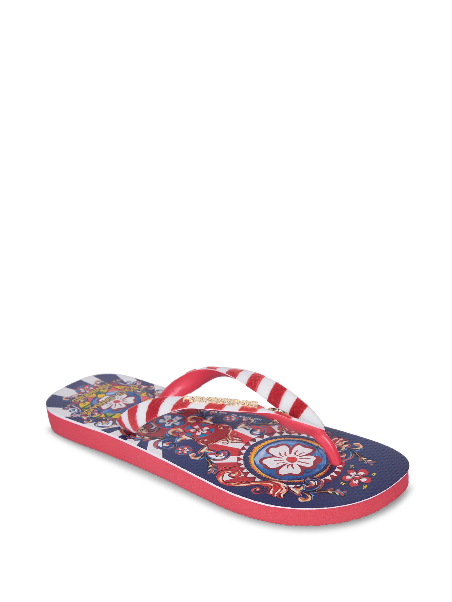 Flip-flops featuring a red and white rubber strap, with a colorful floral pattern on the sole.