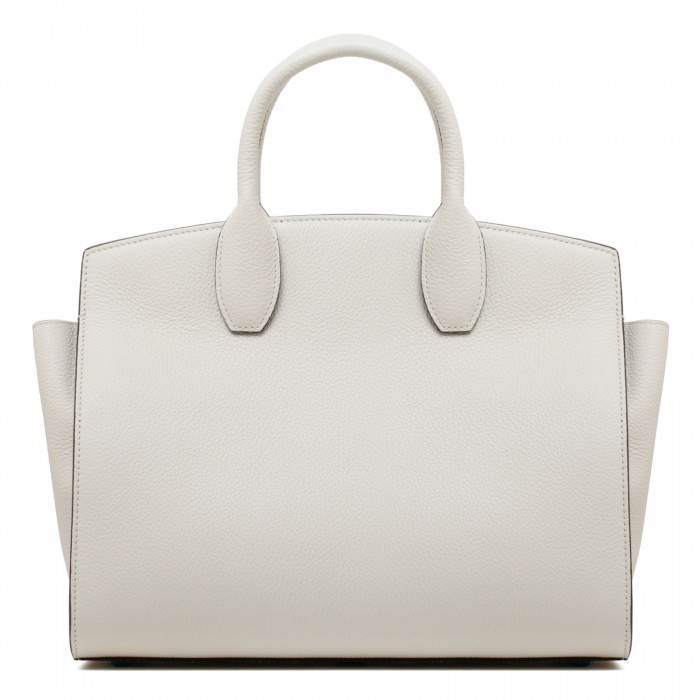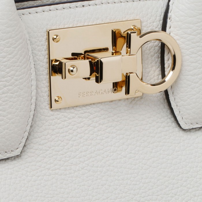 Mascarpone-hue hammered leather Studio M Soft bag from Ferragamo featuring deconstructed silhouette, iconic Gancini slider fastening, adjustable and detachable jacquard tape shoulder strap, double leather top handle, internal zipped pocket.