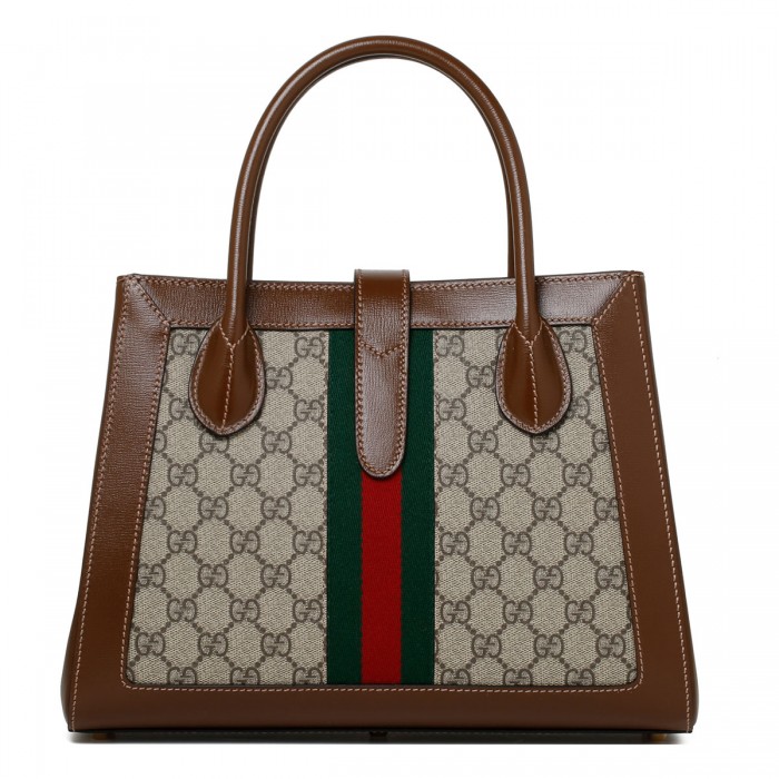 Beige and ebony Supreme canvas Jackie 1961 medium tote bag from Gucci featuring GG motif, with brown leather trims, green and red Web detail, zip closure and piston strap closure, gold-toned hardware, detachable and adjustable shoulder strap, double leather top handle, internal zipped pockets.