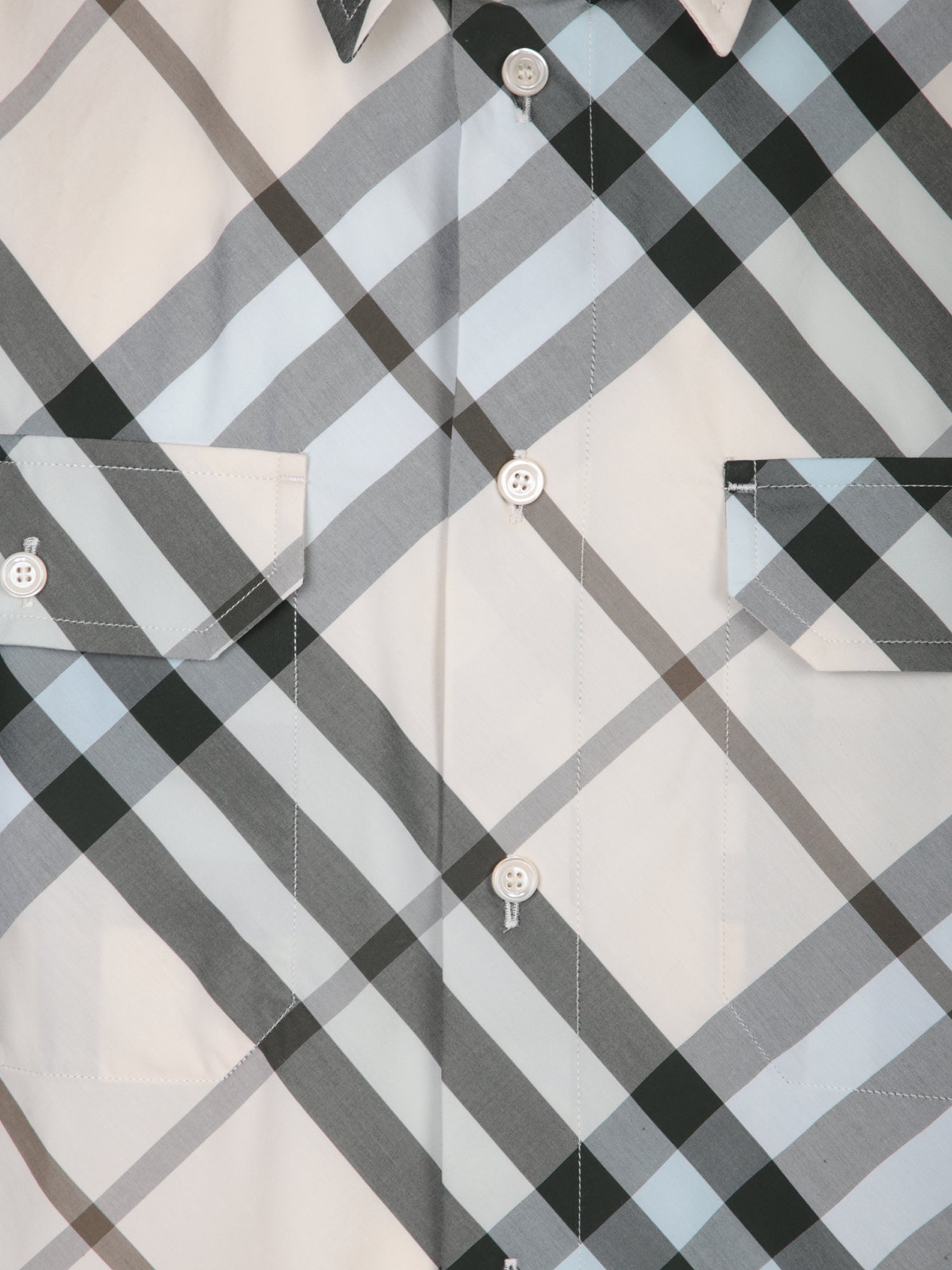 Short sleeve shirt in check fabric. Features two front flap pockets and button closure.