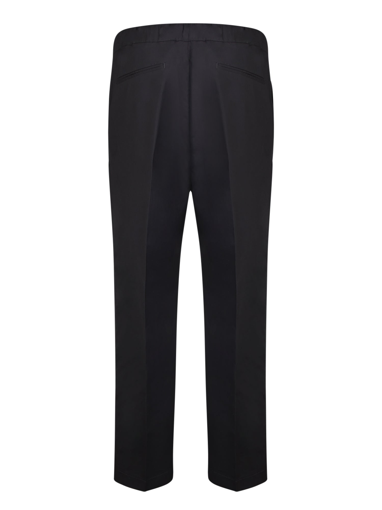 Black straight-leg trousers. Front button and zip fastening. Welt back pockets.