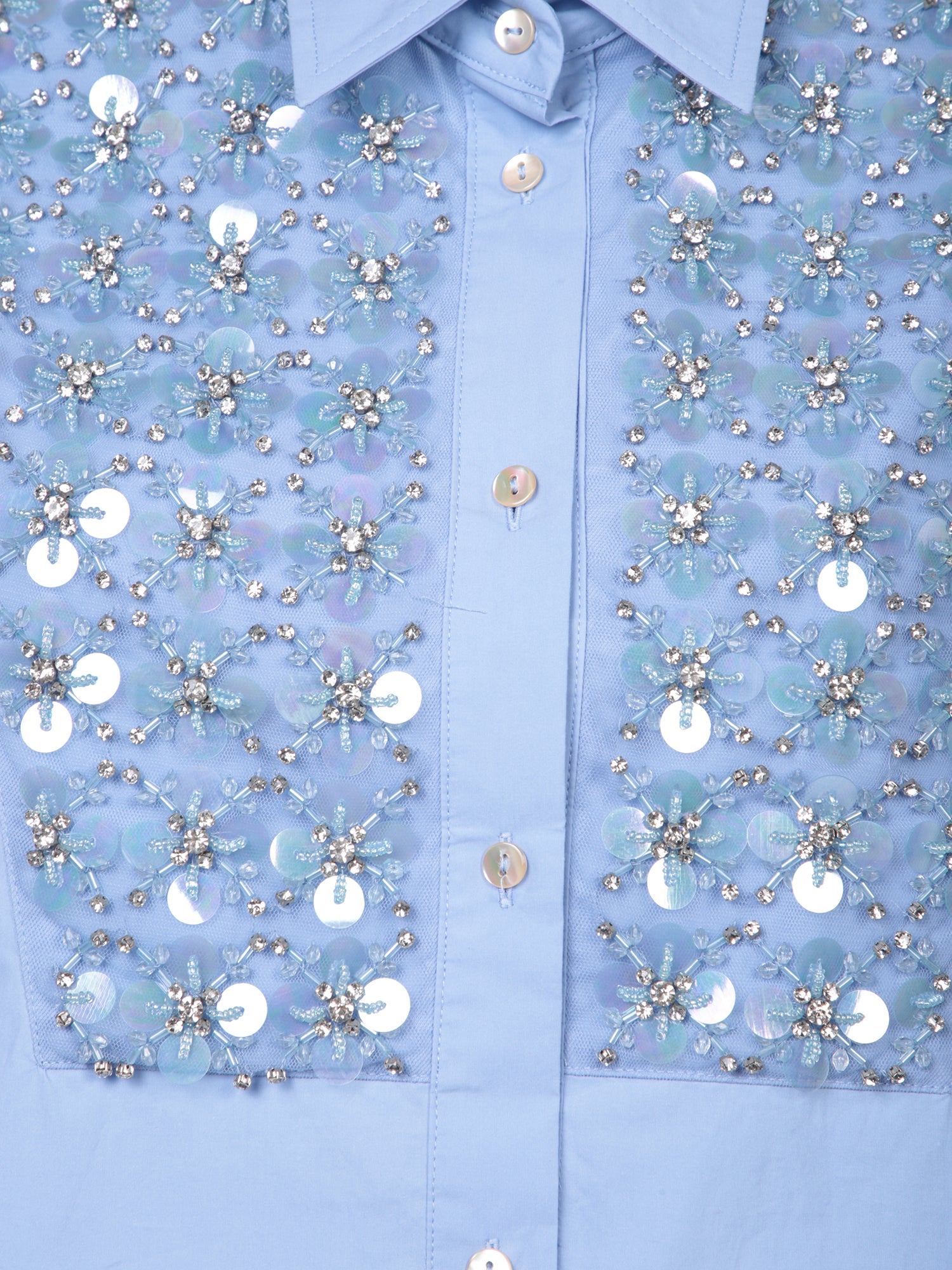 Long sleeve shirt with crystal and pearl embellishments, button front closure.