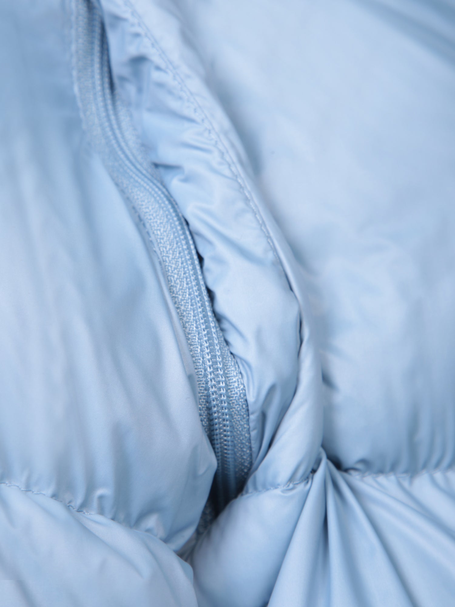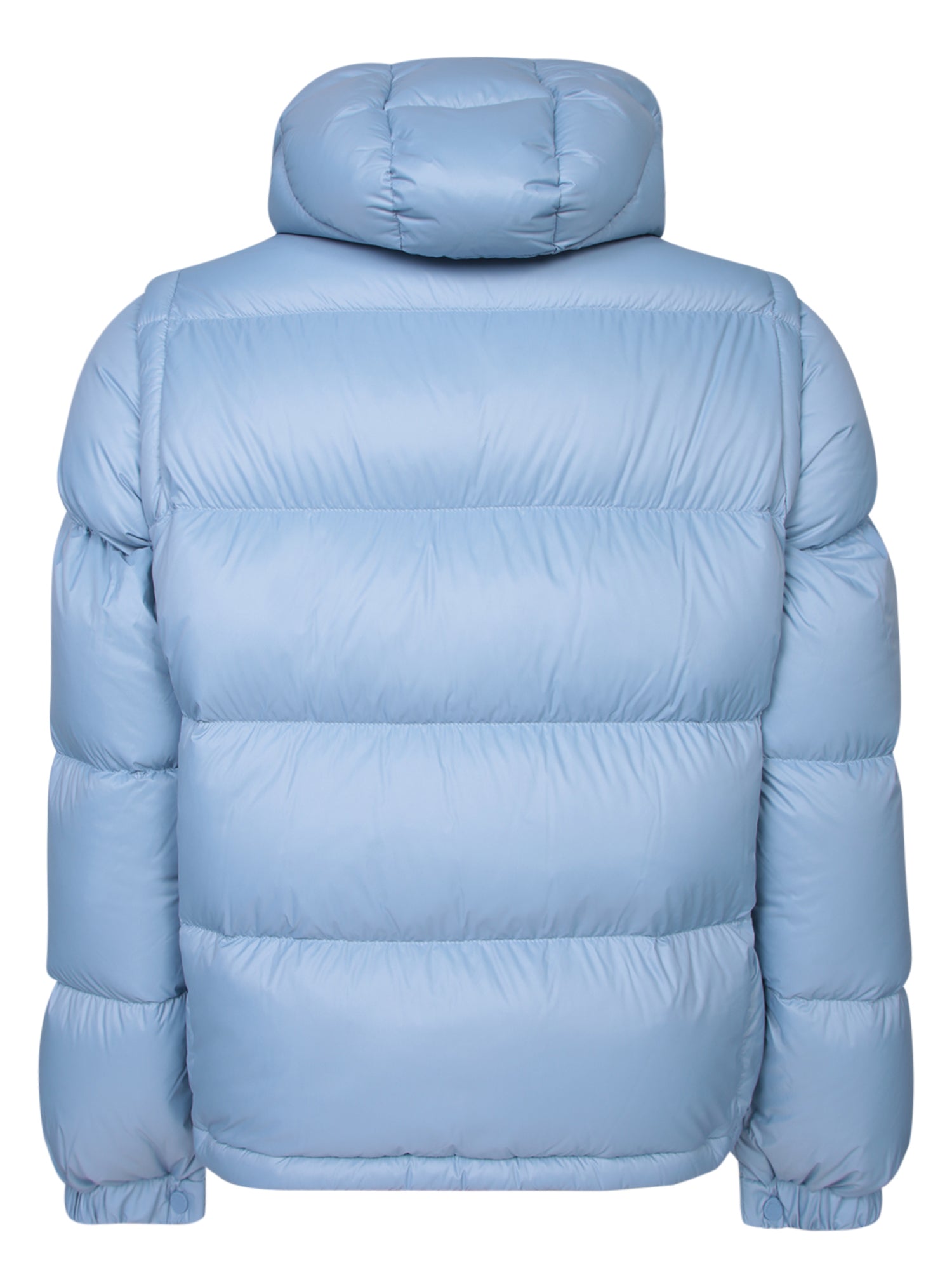Down jacket with integrated hood, snap button front closure, contrasting rubberized logo patch on the left arm.