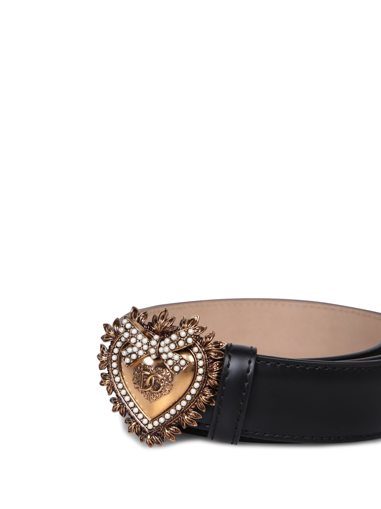 The Devotion belt signed Dolce&ampGabbana features a handmade jewel heart buckle with pearl inlays