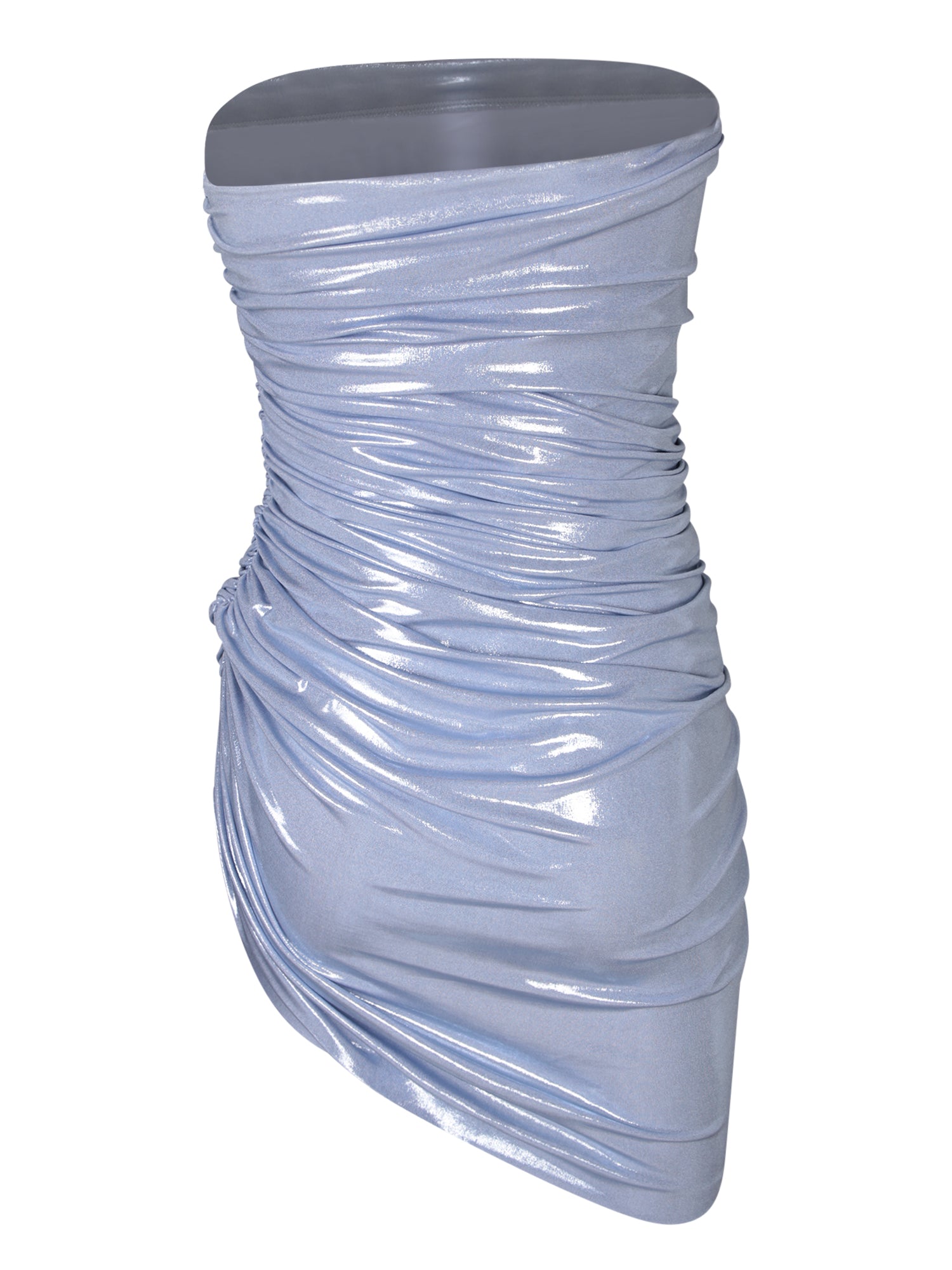 Sleeveless, one-shoulder dress, metallic fabric with draping. Mini length.