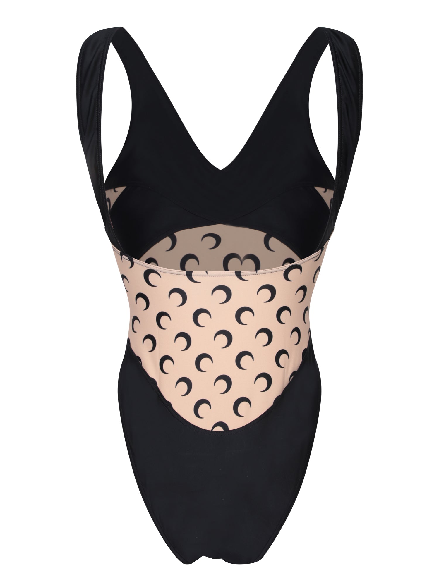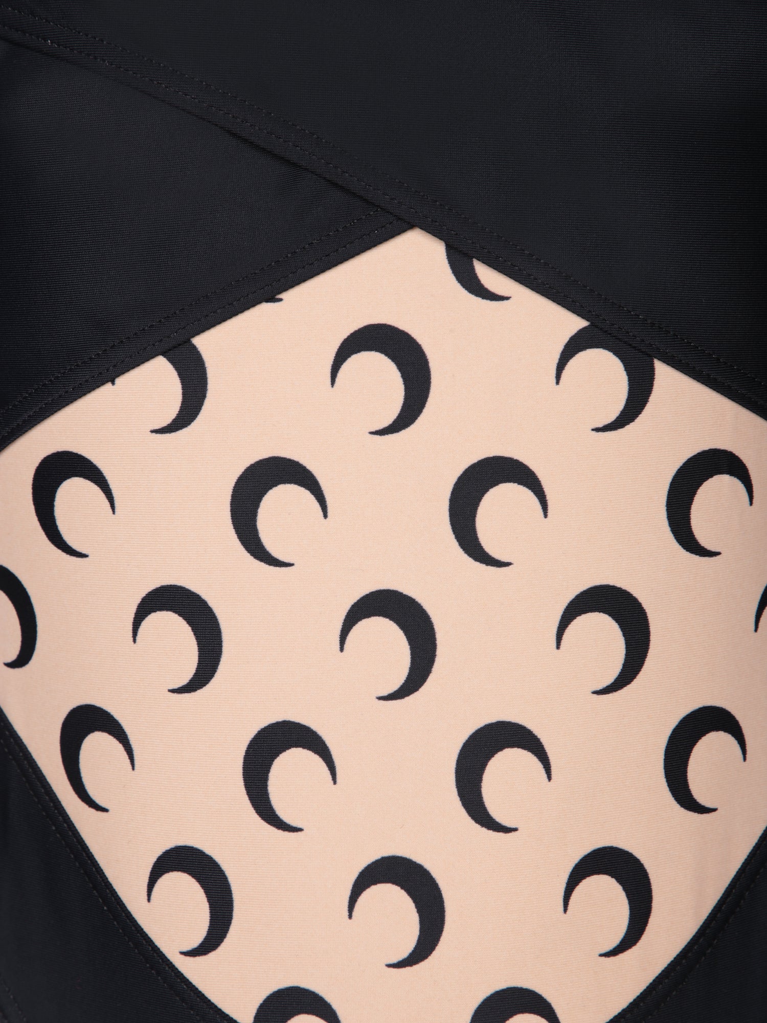 Sleeveless jersey bodysuit, beige panel with moon print, cross-front design.
