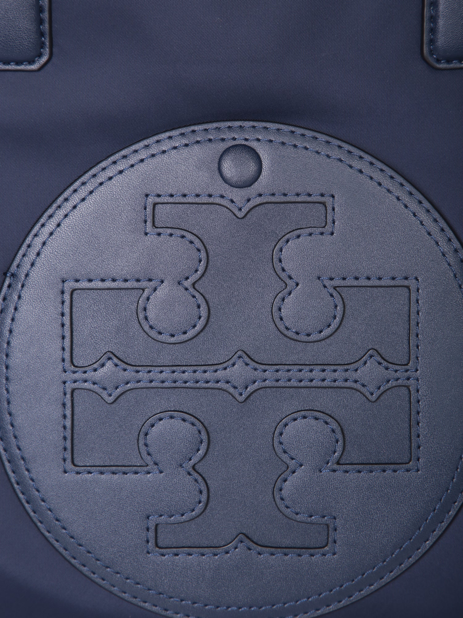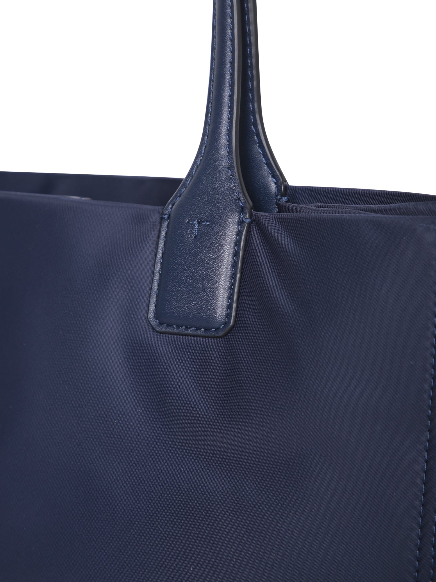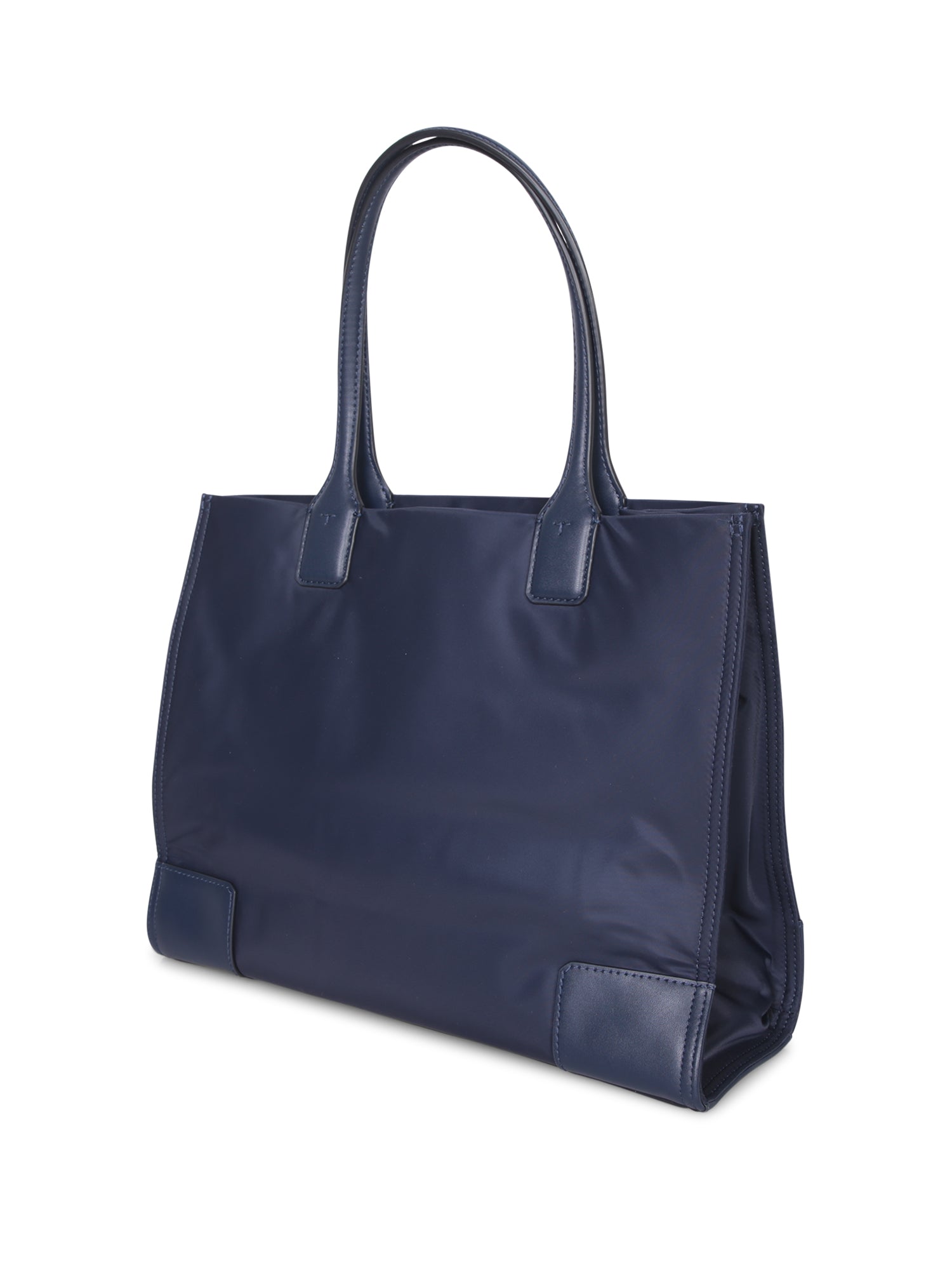 Crafted from durable nylon with leather trims. Features a large main compartment and leather handles.