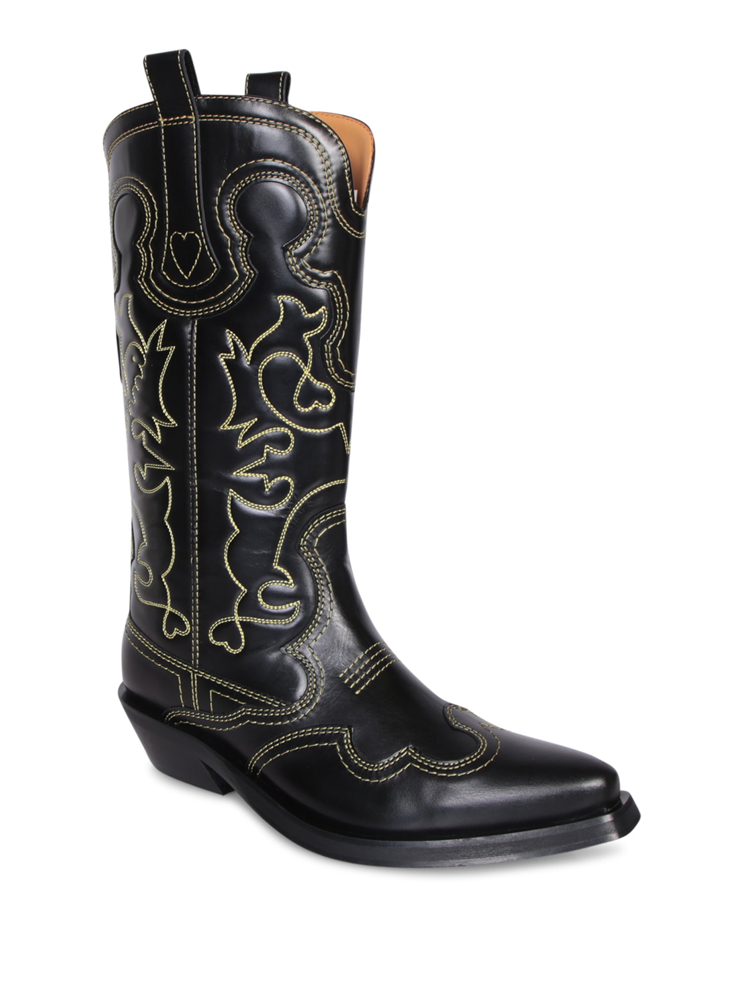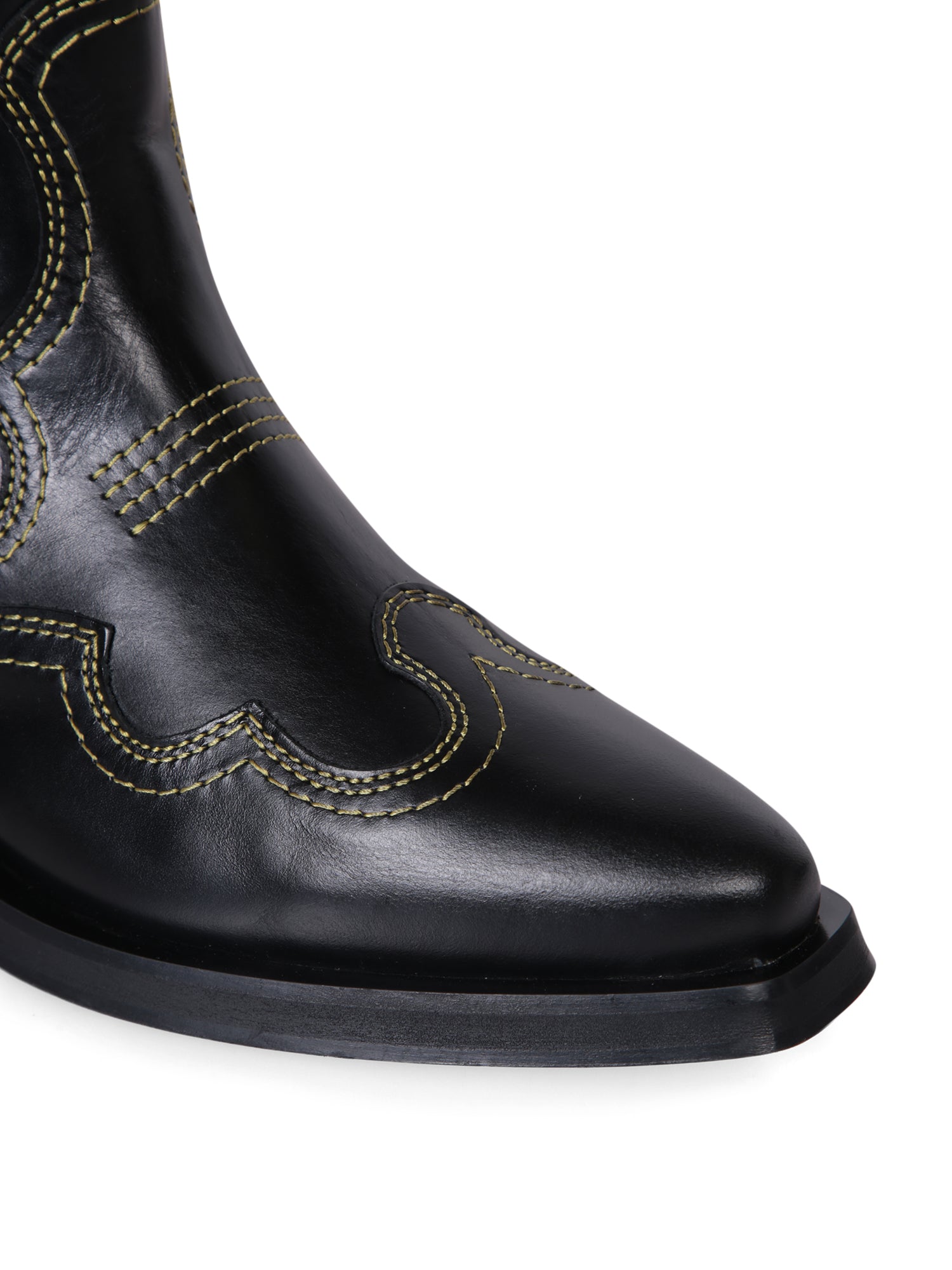 Leather cowboy boots with contrasting yellow embroidery. Blunt toe and low Cuban heel.