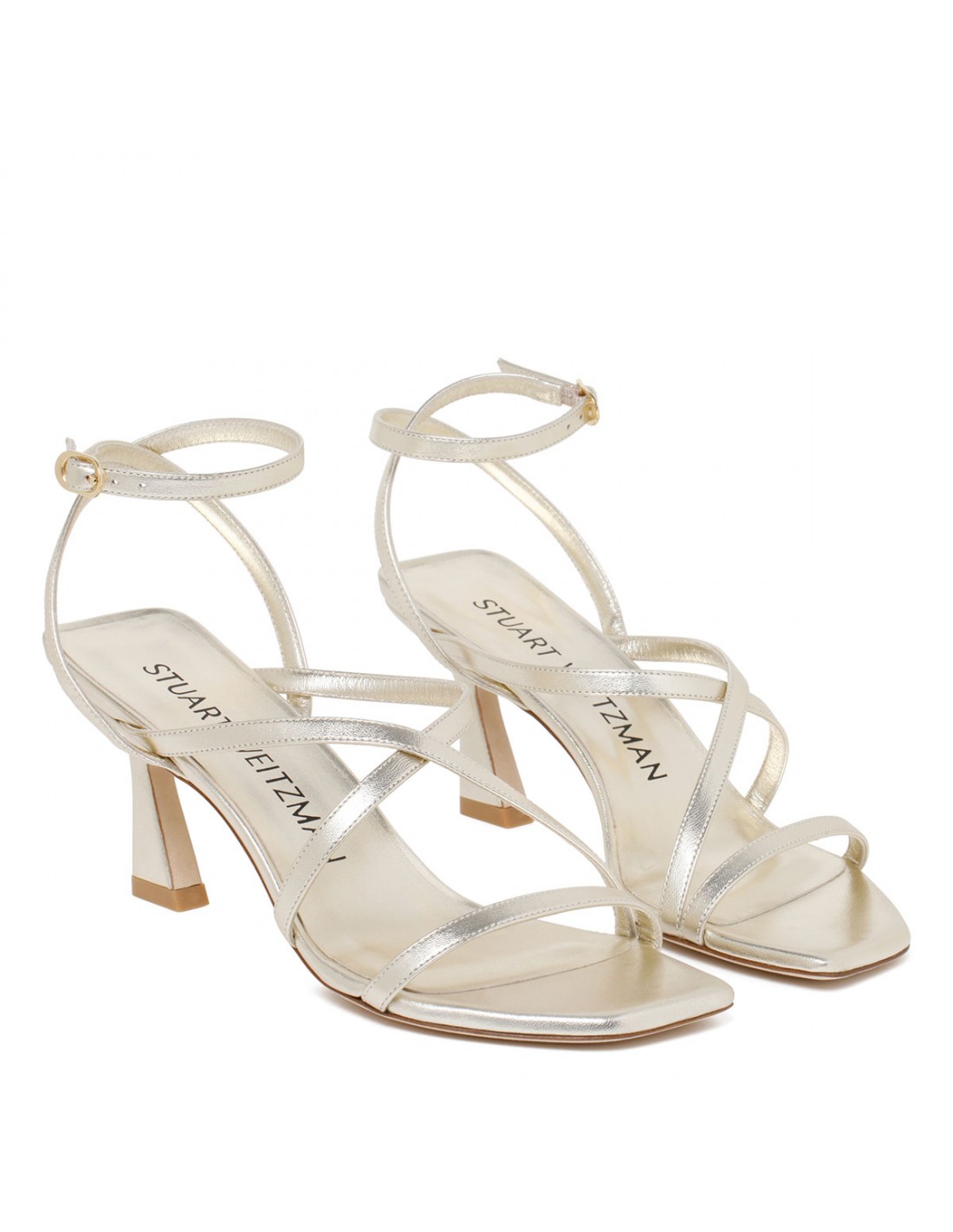 Light gold leather Oasis sandals from Stuart Weitzman featuring crossover straps, square open toe, 75 sculptural heel, adjustable ankle strap, leather insole and sole.