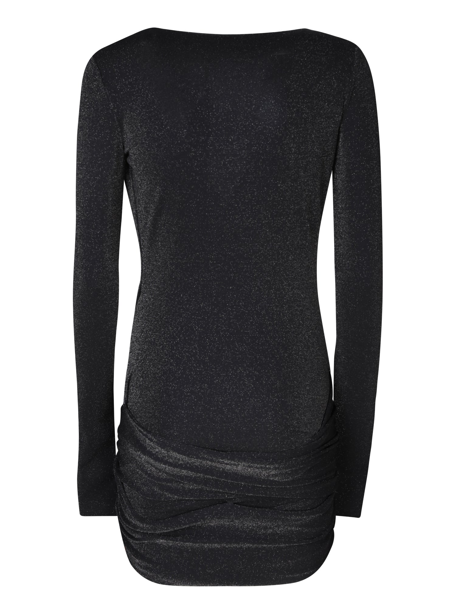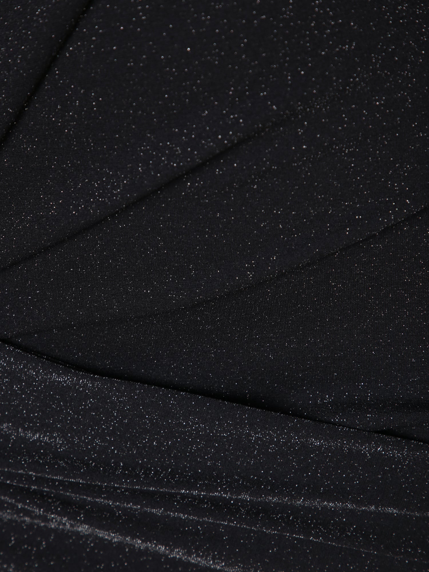 The EZRI Lurex Black Dress unveils a sophisticated and feminine silhouette, featuring an elegant V-neck and draped details that flatter the figure.
