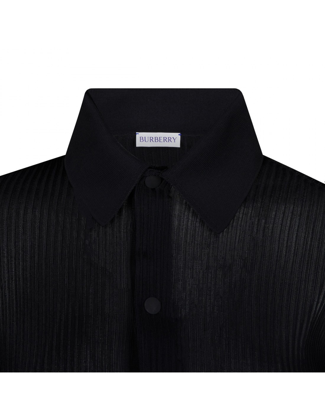 Black gauzy rib-knit viscose shirt from Burberry featuring Equestrian Knight Design at hem, press-stud closure, pointed collar, long sleeves and slim fit.