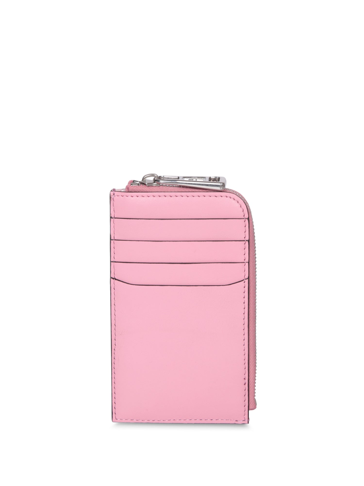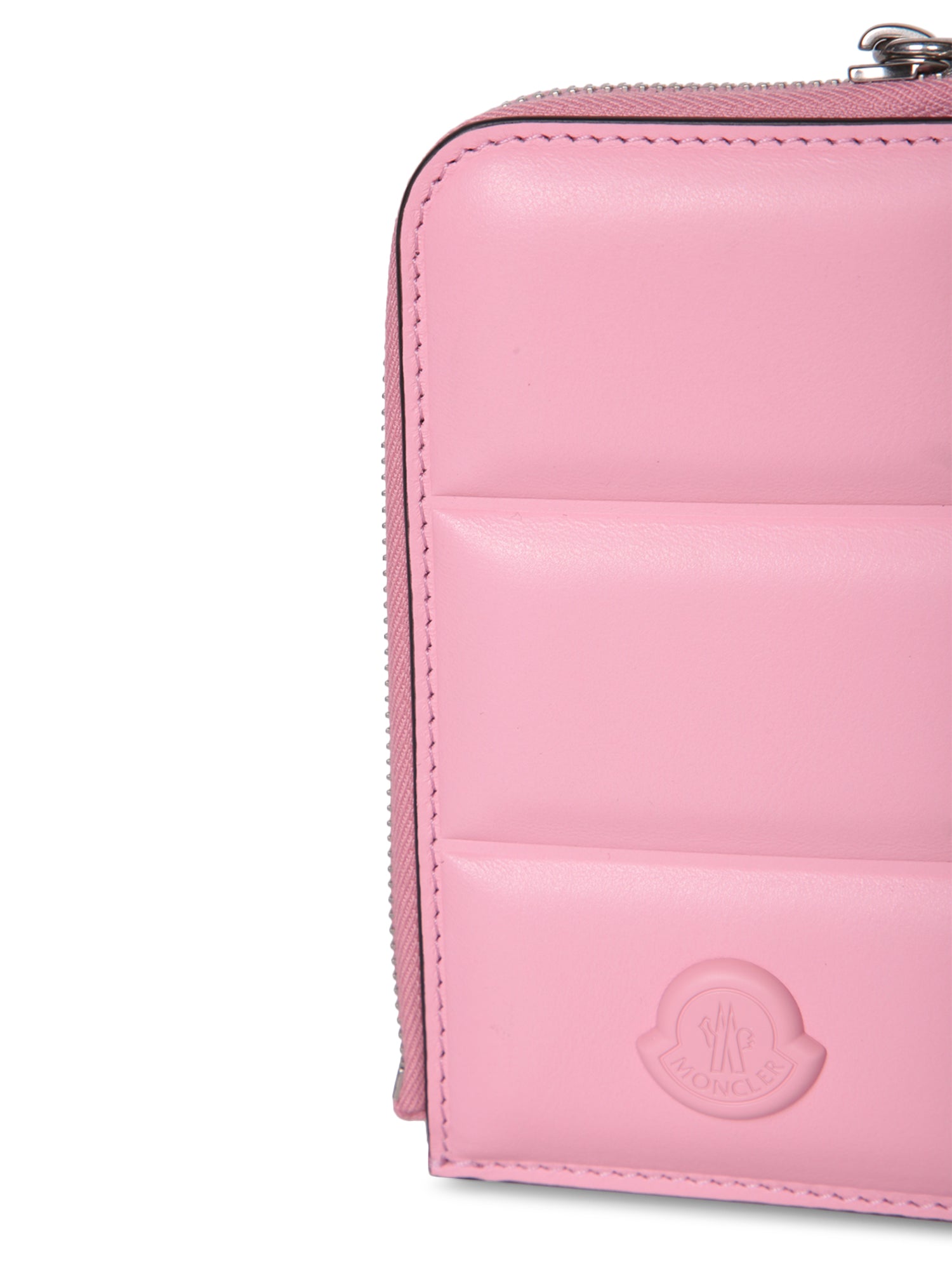 Pink leather card holder with zip closure. Embossed Moncler logo.