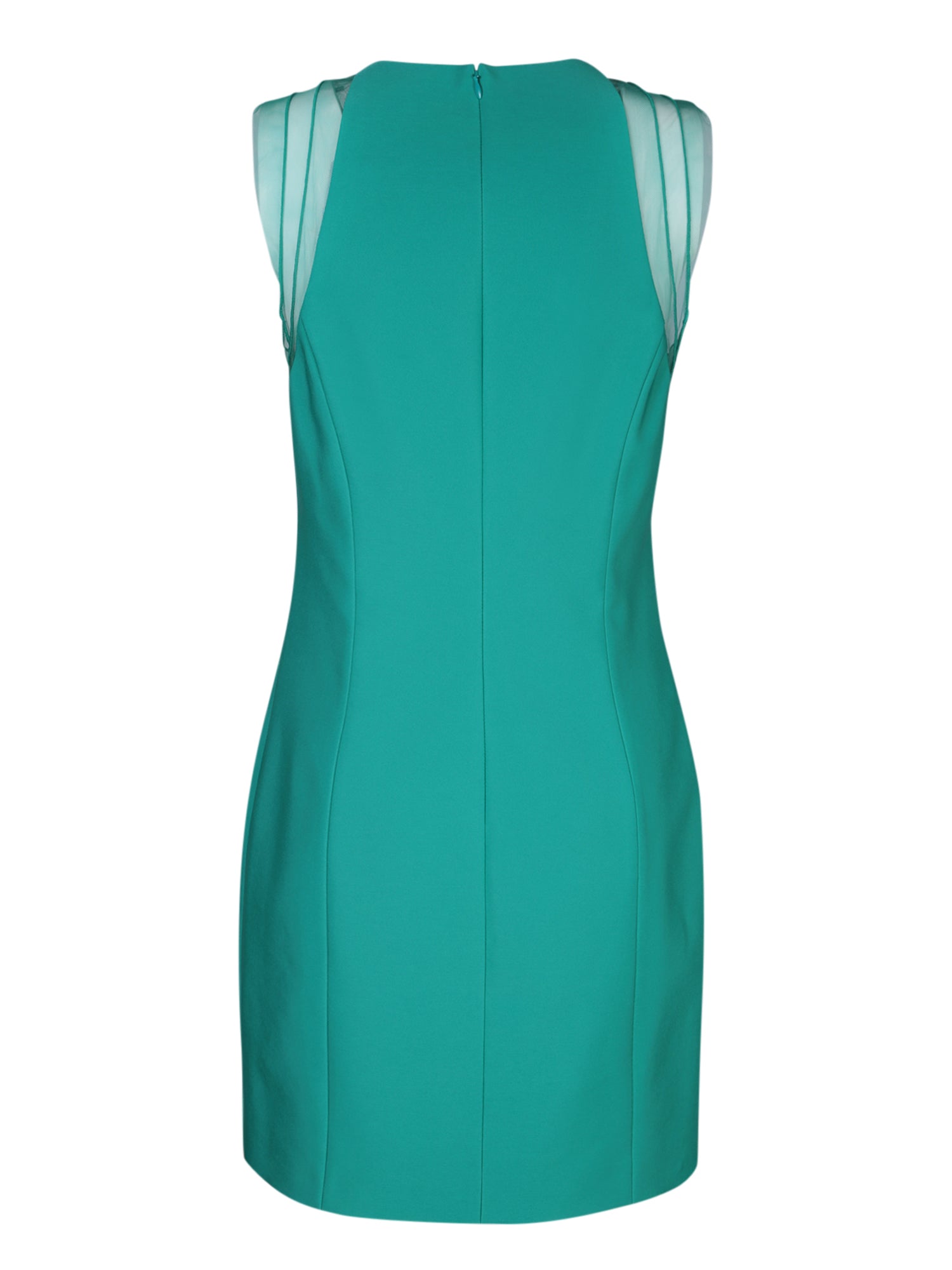 Genny's green stretch cady mini dress with sophisticated details: an enticing V-neck and tulle inserts for a hint of sheerness.