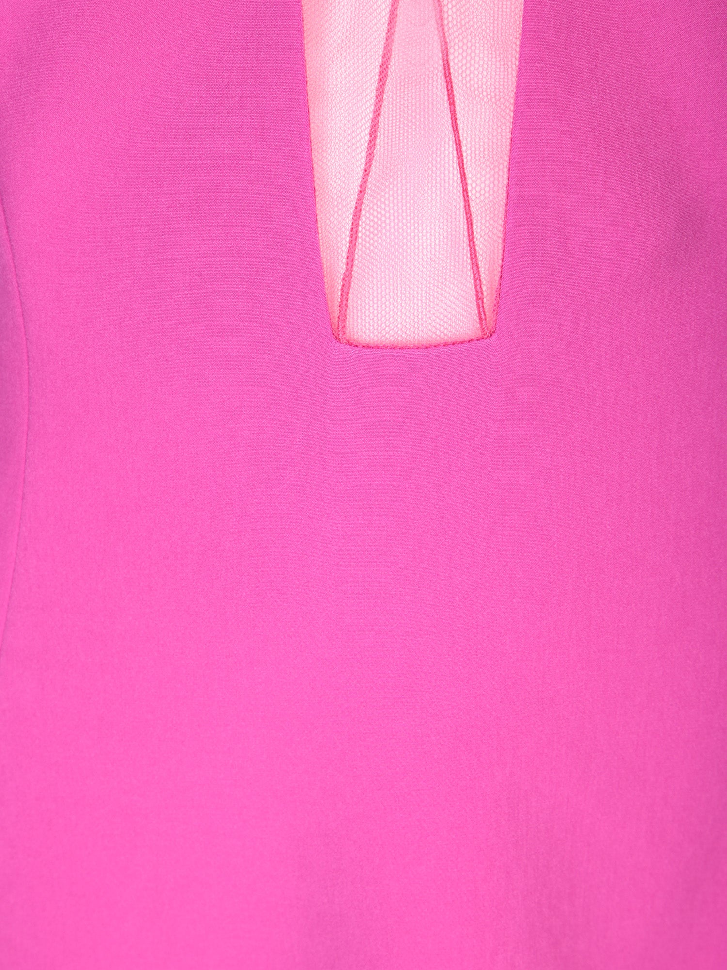 Elegant GENNY gown featuring a deep V-neck and sheer tulle for a touch of allure, daring slit for graceful movement, impeccably structured to enhance the silhouette.