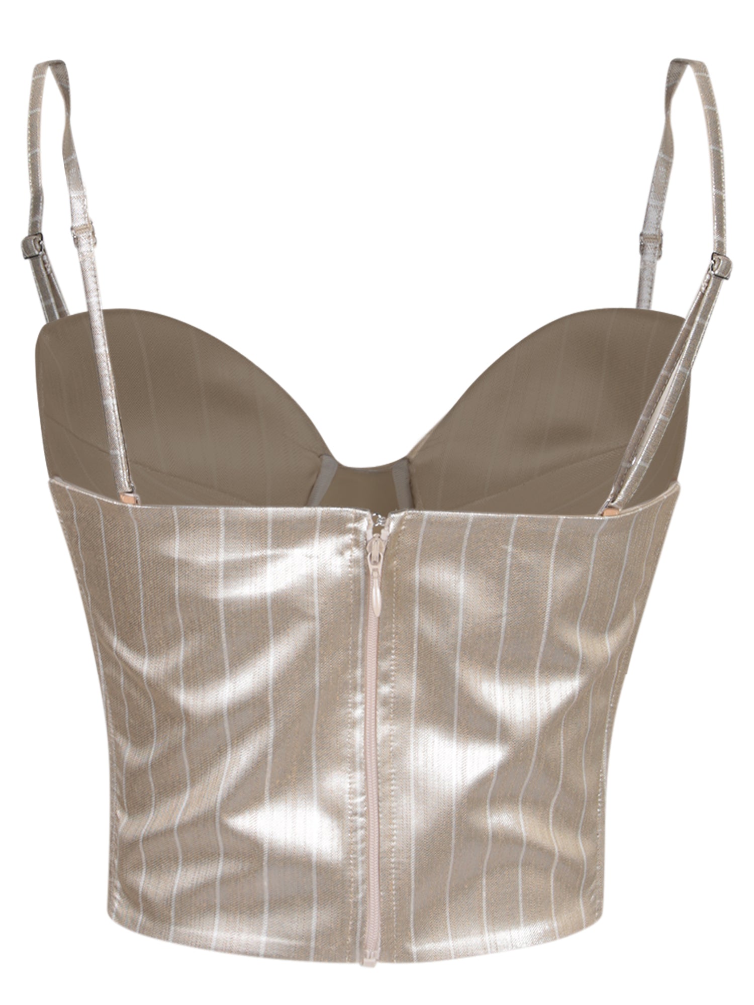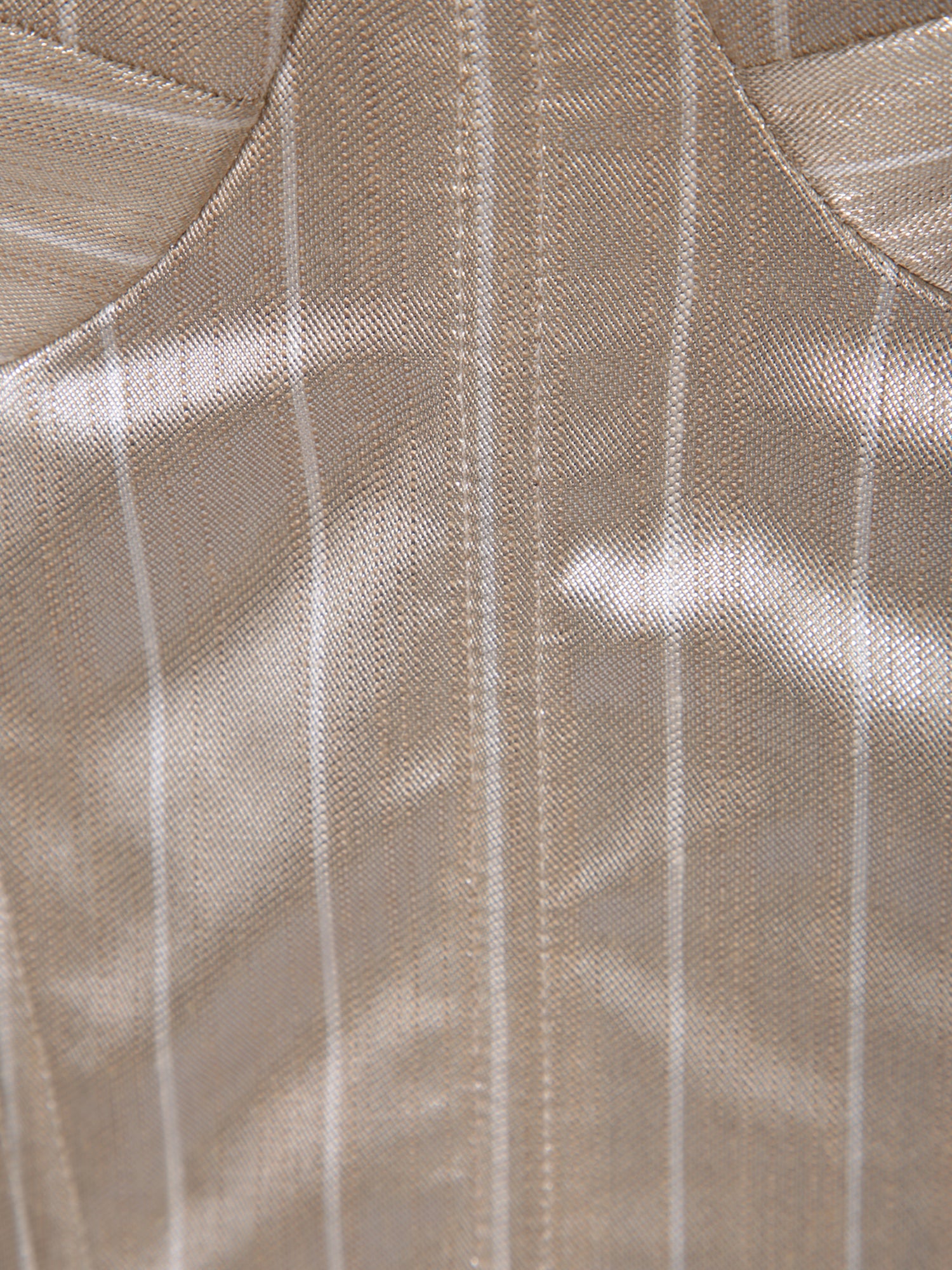 The GENNY Pinstriped Satin Sand Corset Top embodies modern elegance. A structured design to enhance the figure, high-quality finishing, and precise detailing offer a touch of sophistication.
